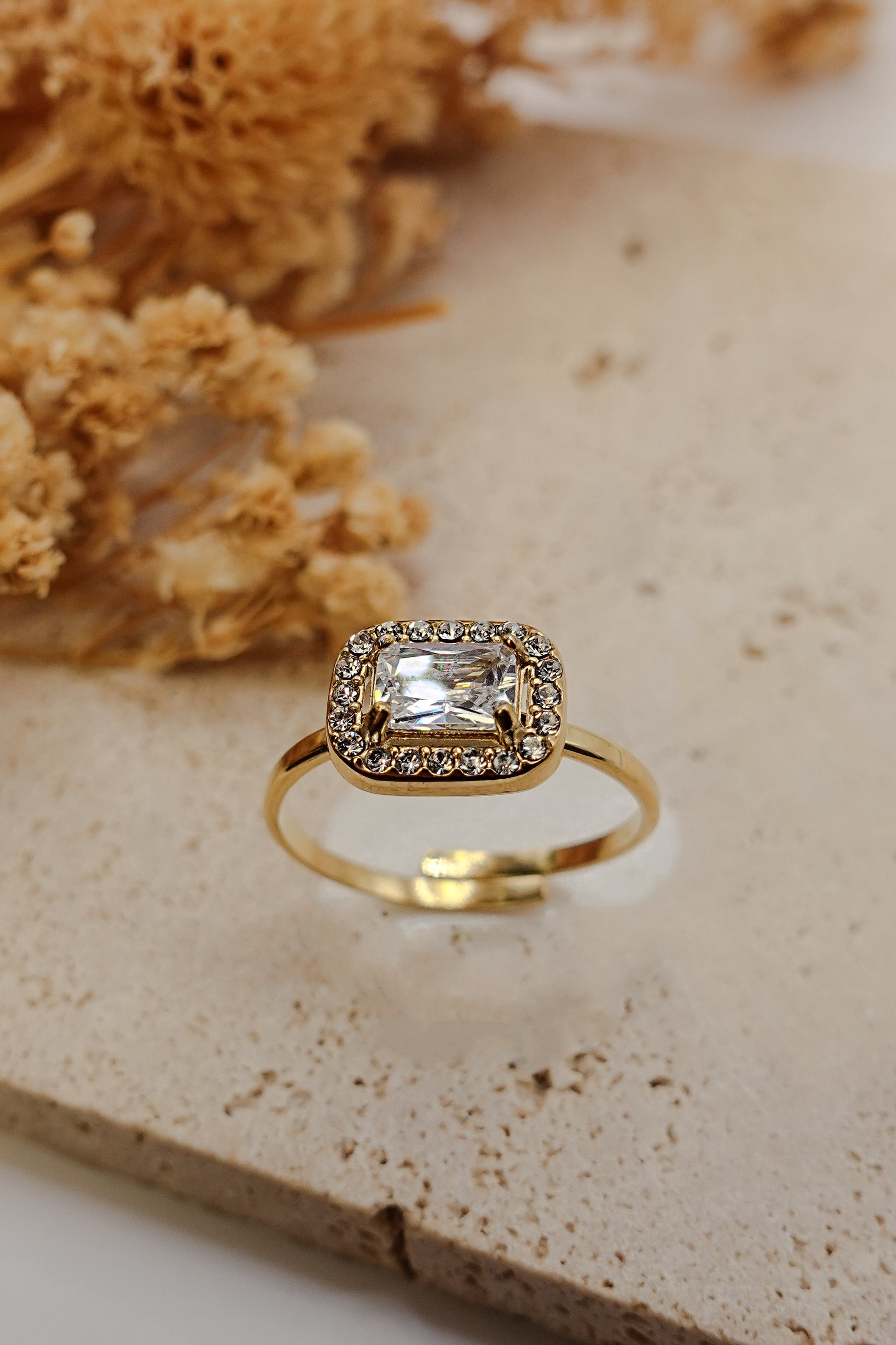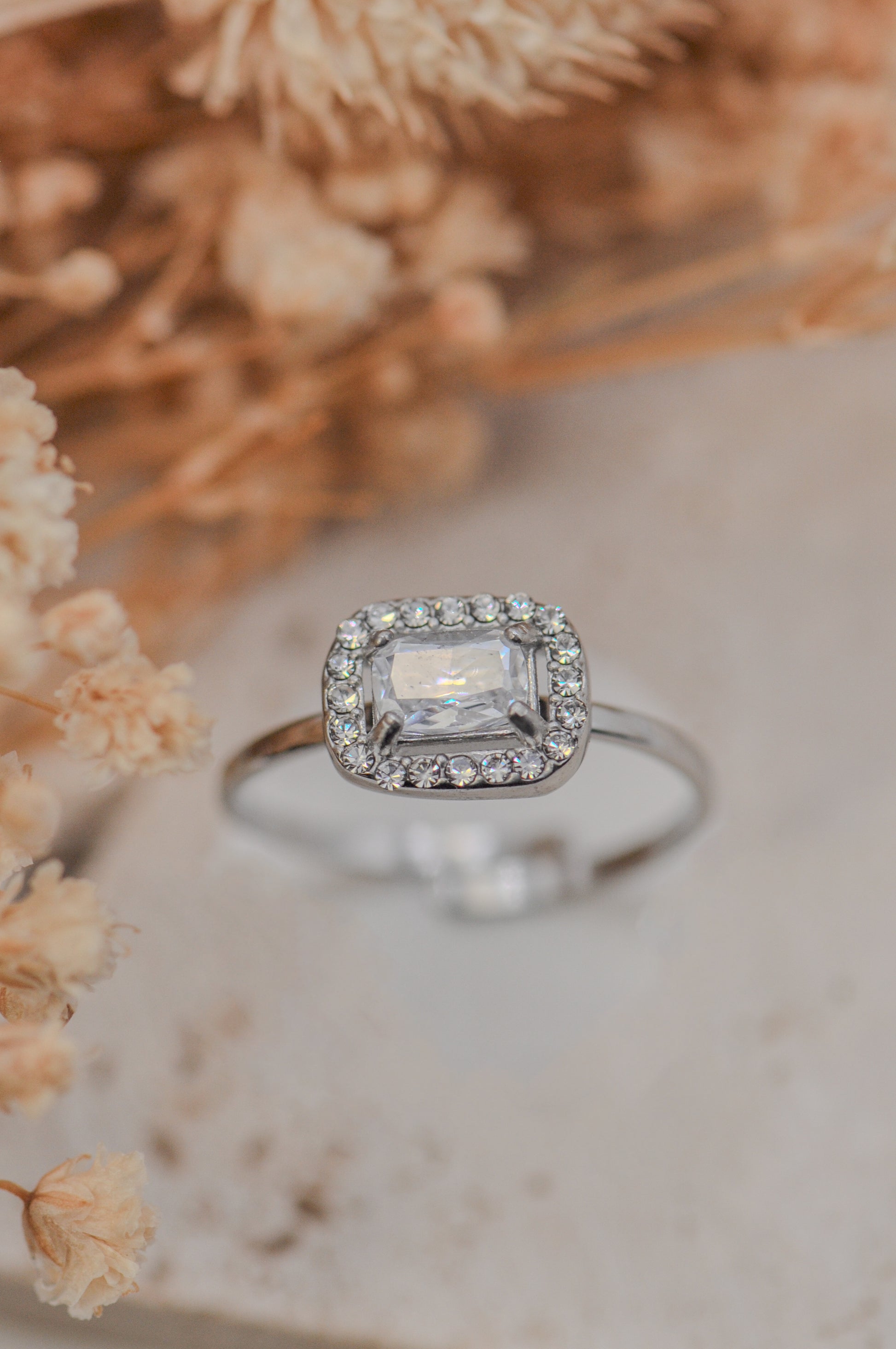 Brillez avec la magnifique bague Alïa en acier inoxydable, ornée d’une pierre rectangulaire en zircon entourée de petits cristaux étincelants.