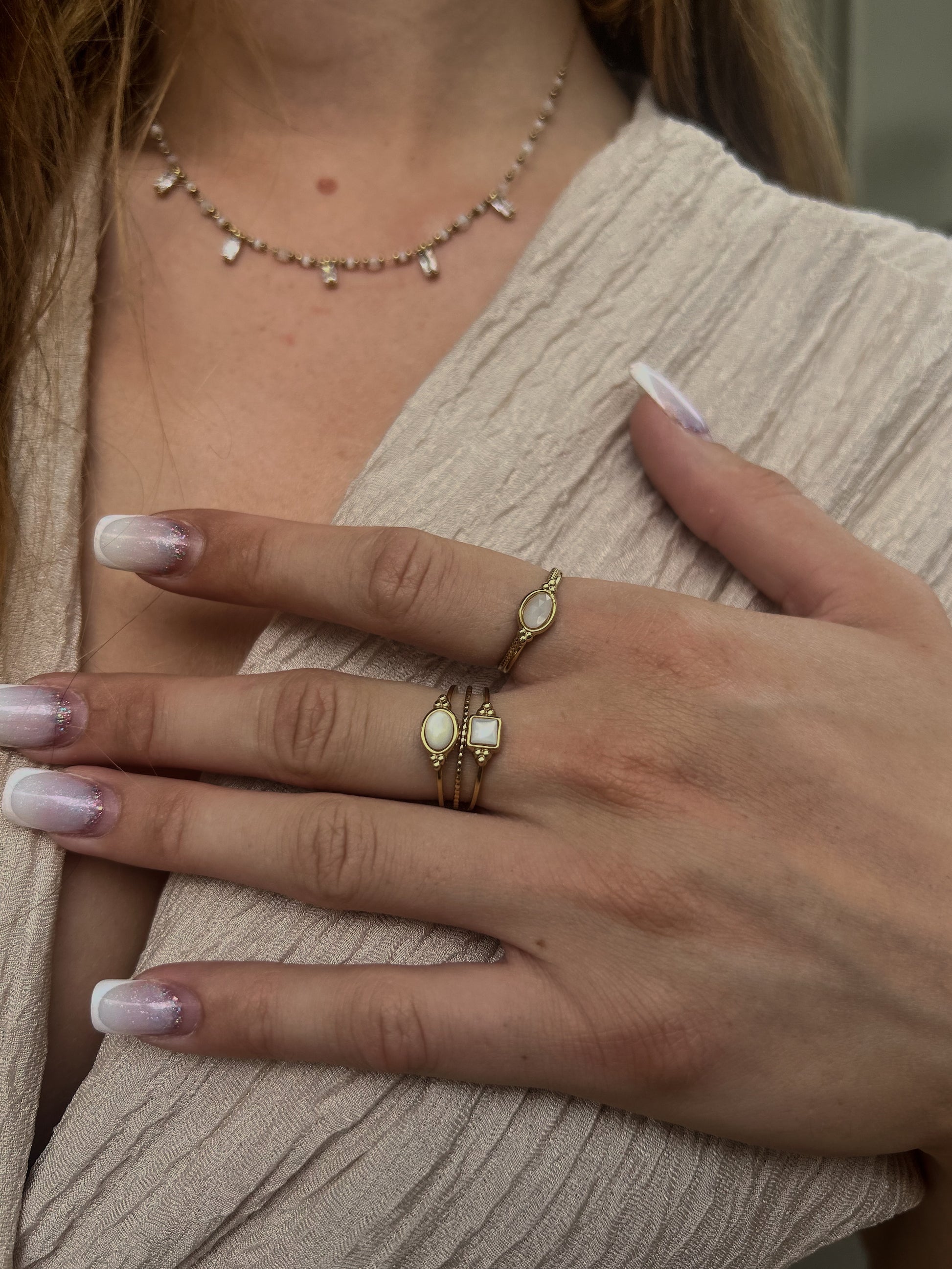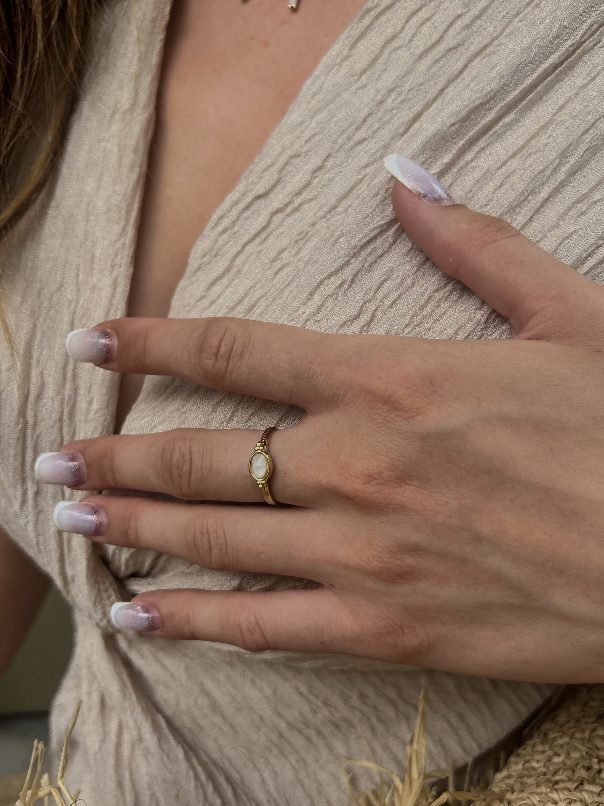Bague ajustable en acier inoxydable composée d'une pierre naturelle. La bague Amal est à la fois minimaliste et élégante. Elle est idéale pour être associée à d'autres bagues.Tous nos bijoux résistent à l'eau, au soleil et ne rouillent pas dans le temps.