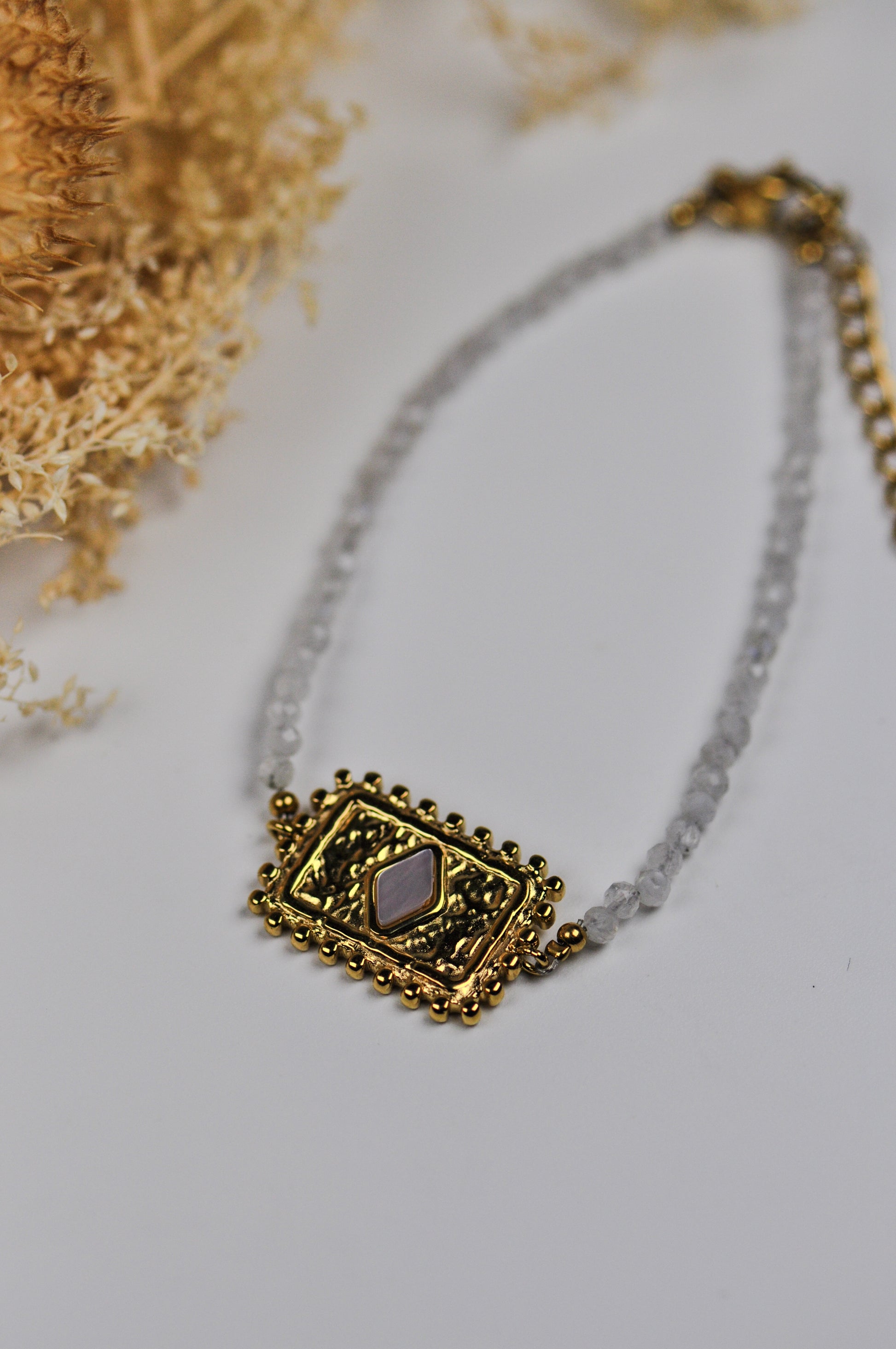 Bracelet en acier inoxydable orné de pierres d'Agathe Blanche et d'un pendentif composé d'une pièce martelée rectangulaire avec de la Nacre. Tous nos bijoux résistent à l'eau, au soleil et ne rouillent pas dans le temps.