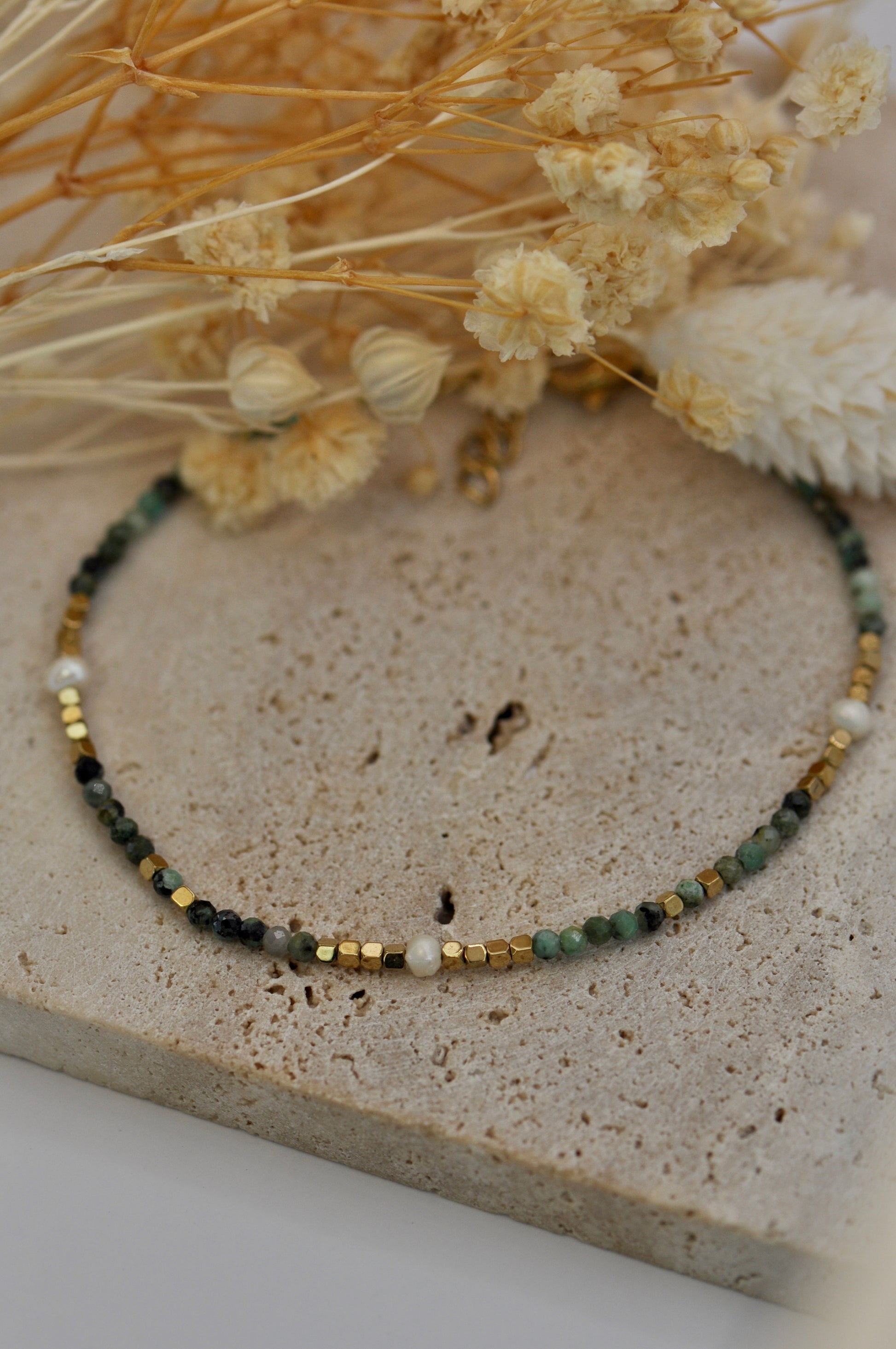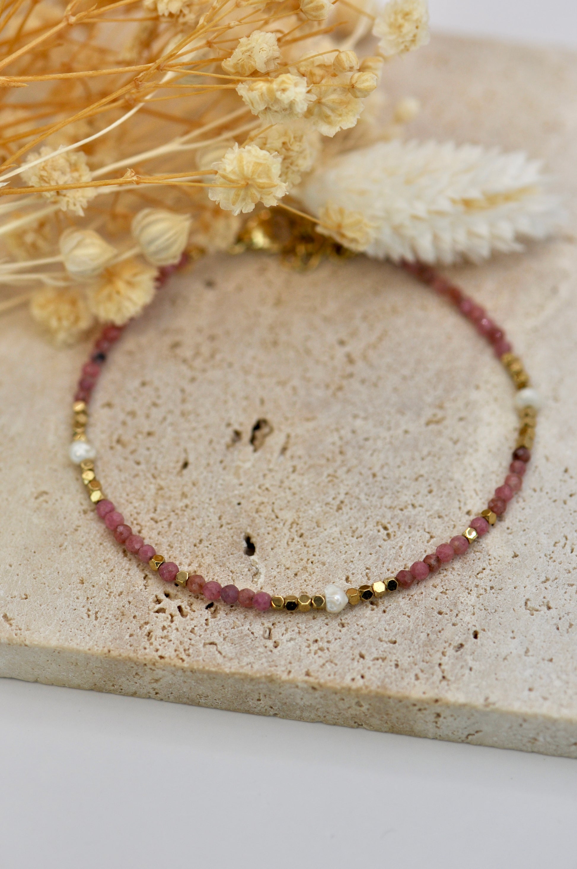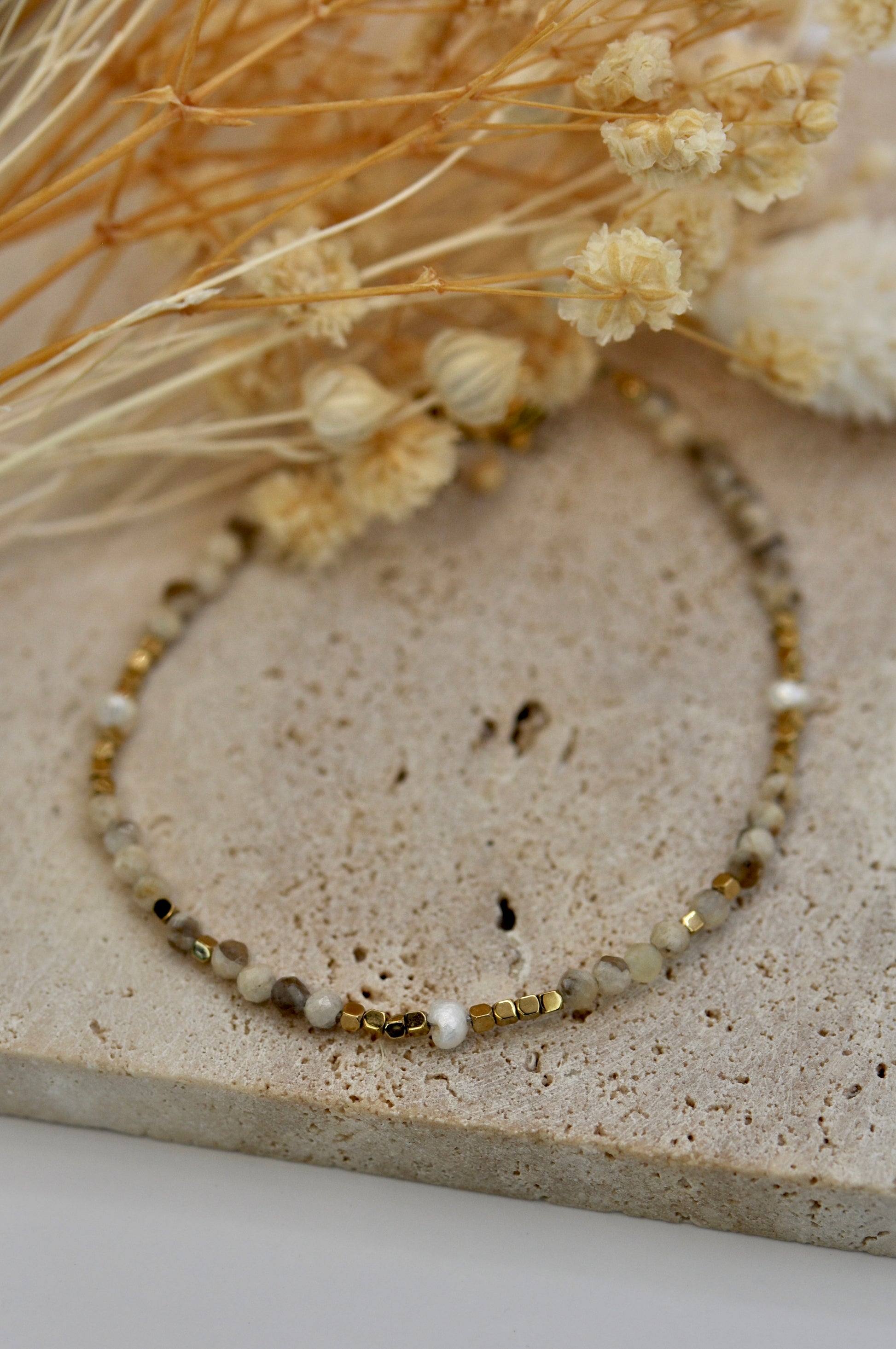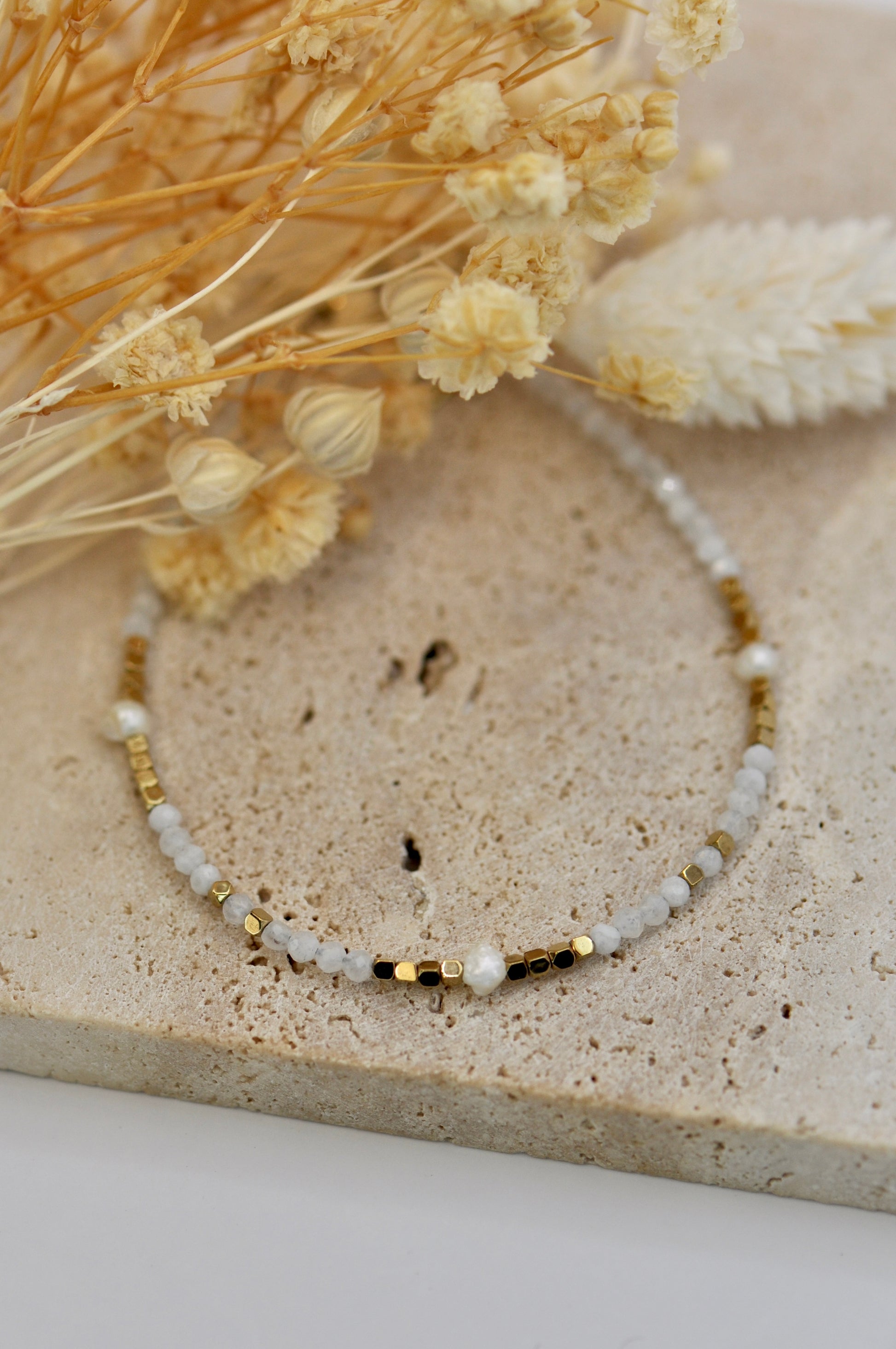 Délicat et lumineux, le bracelet Bola sublime le poignet avec finesse. Composé d'un enchaînement harmonieux de pierres naturelles et de perles d'eau douce, il apporte une touche subtile d'éclat et de douceur.