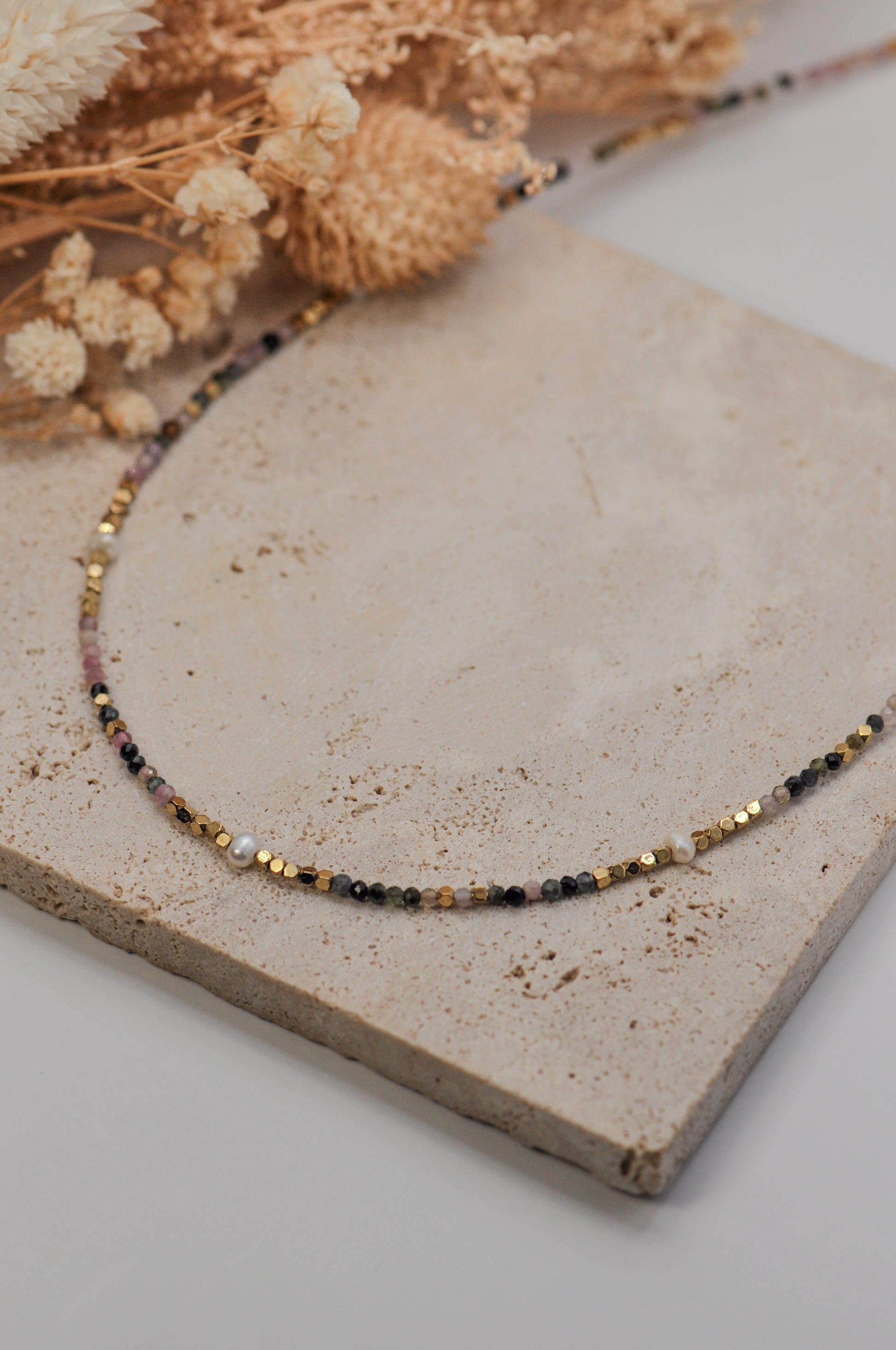 Collier en acier inoxydable orné de pierres naturelles, de perles d'eau douce et de perles en acier inoxydable. Tous nos bijoux résistent à l'eau, au soleil et ne rouillent pas dans le temps.