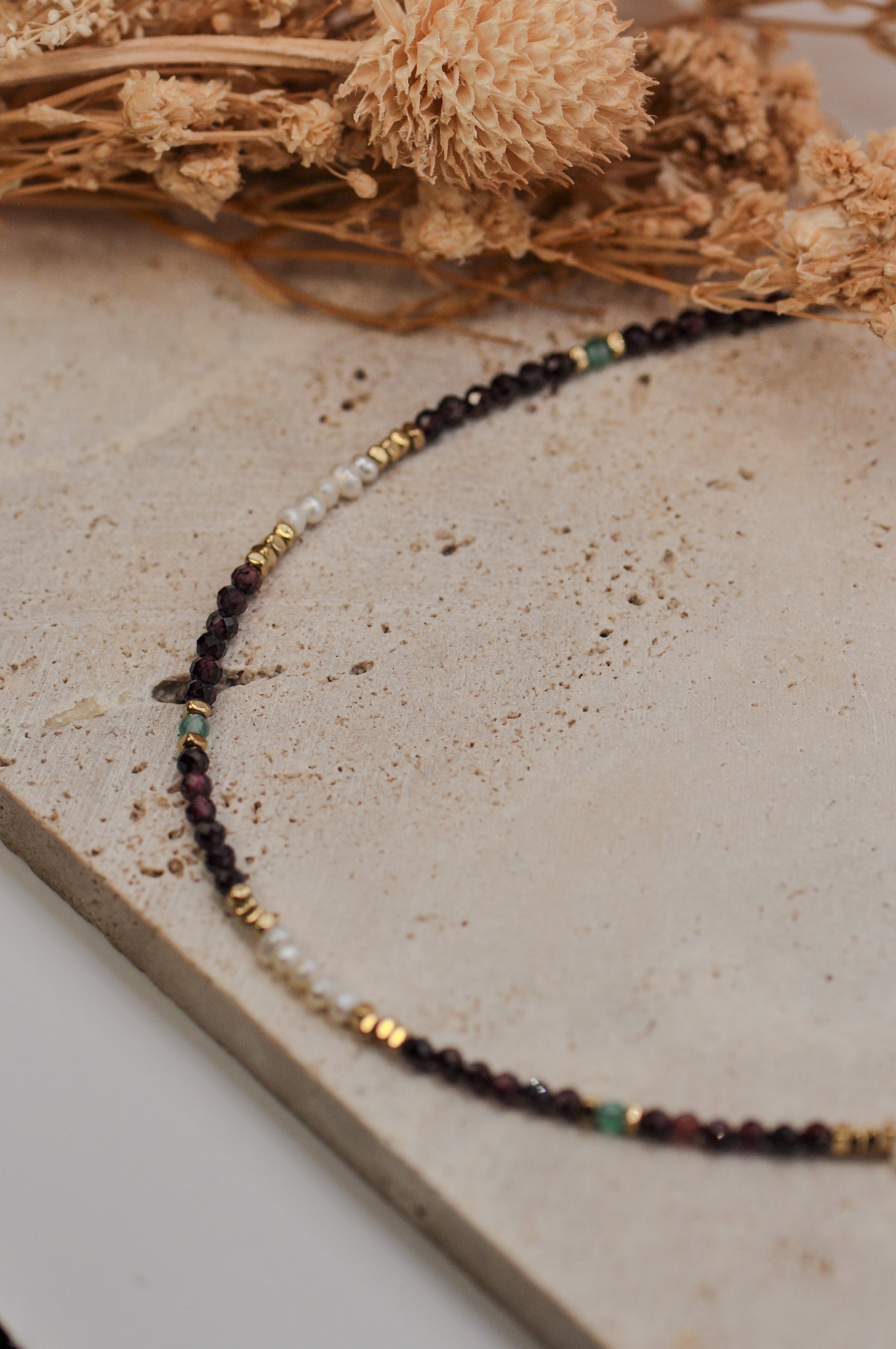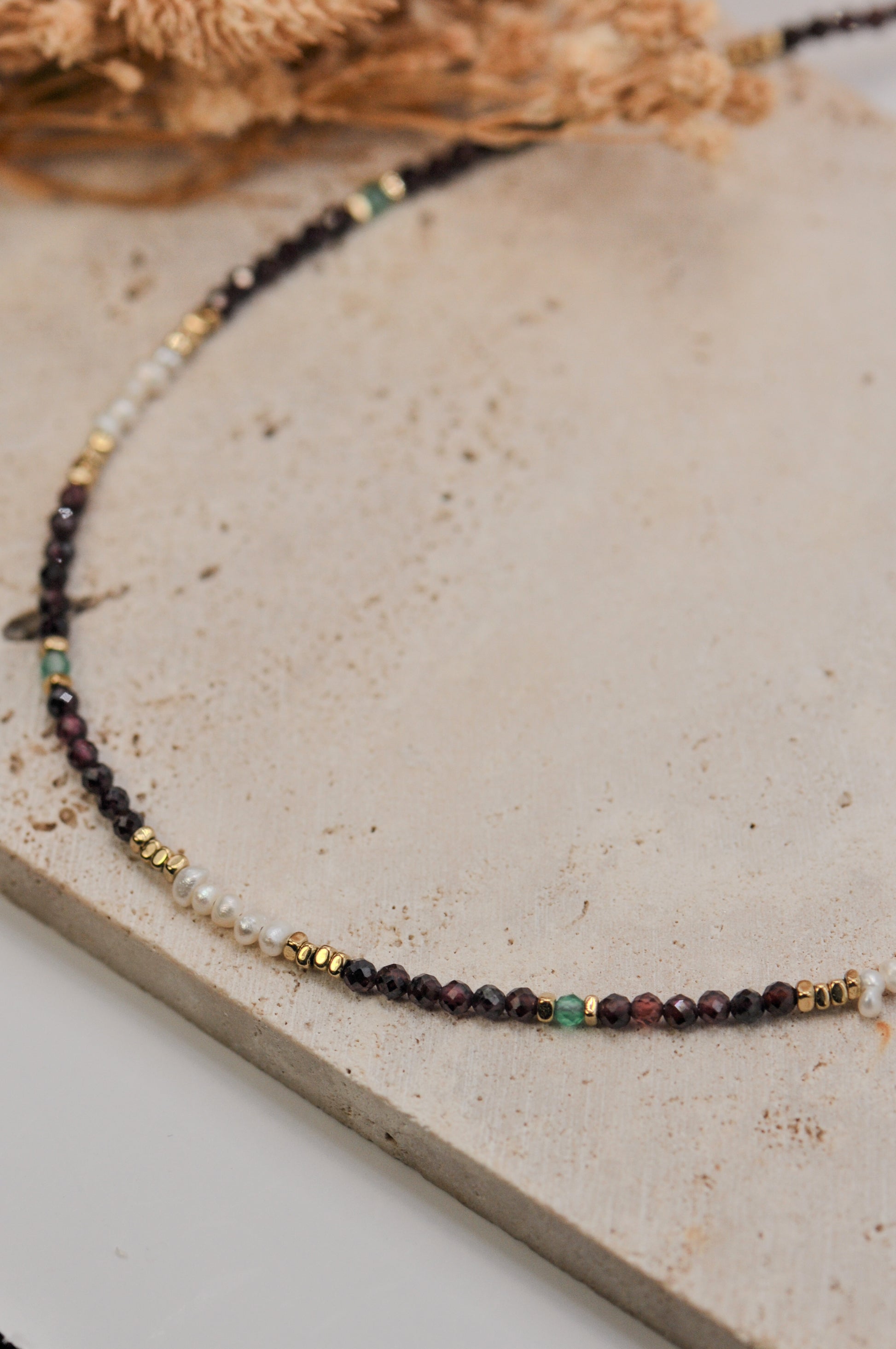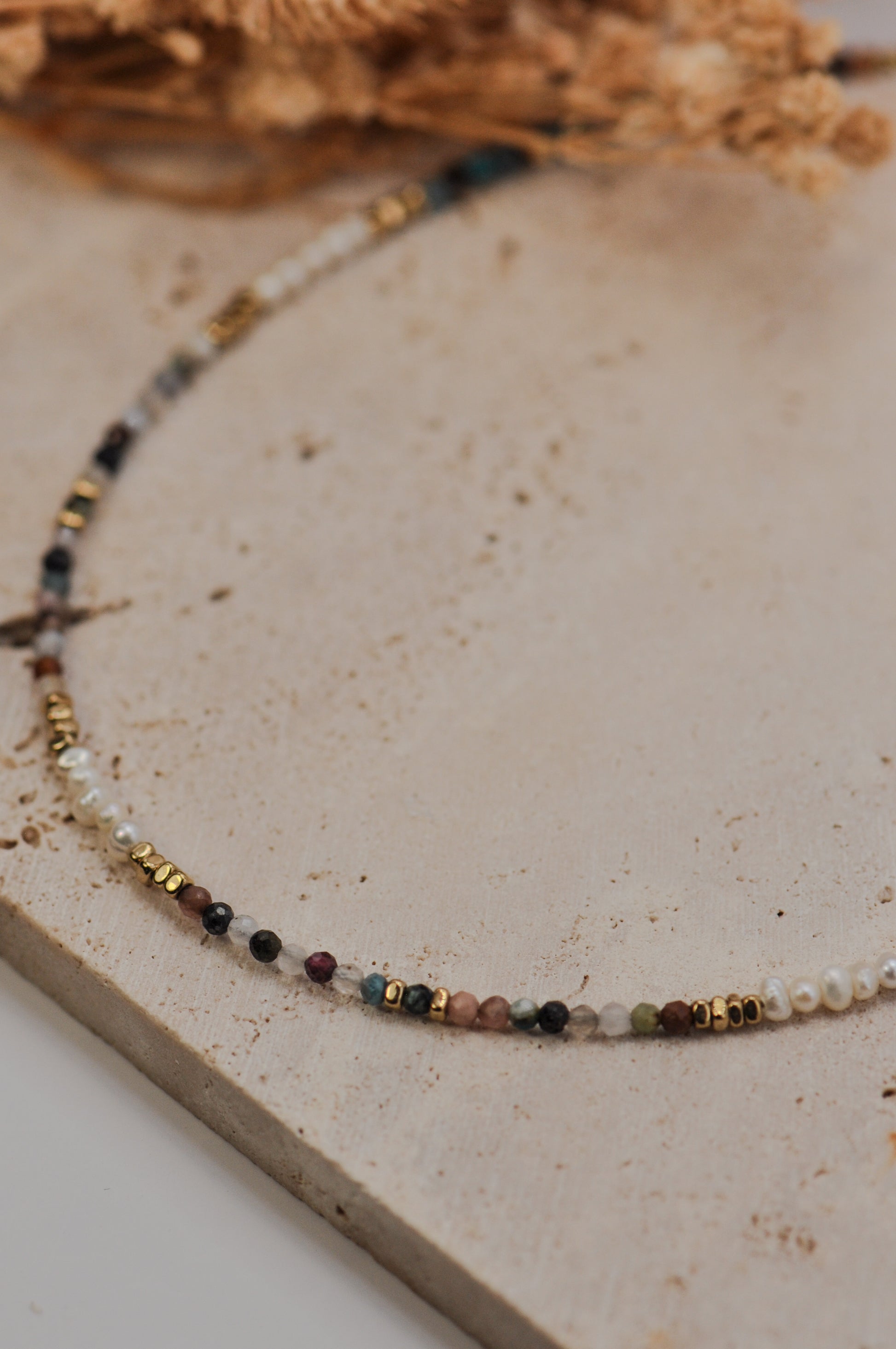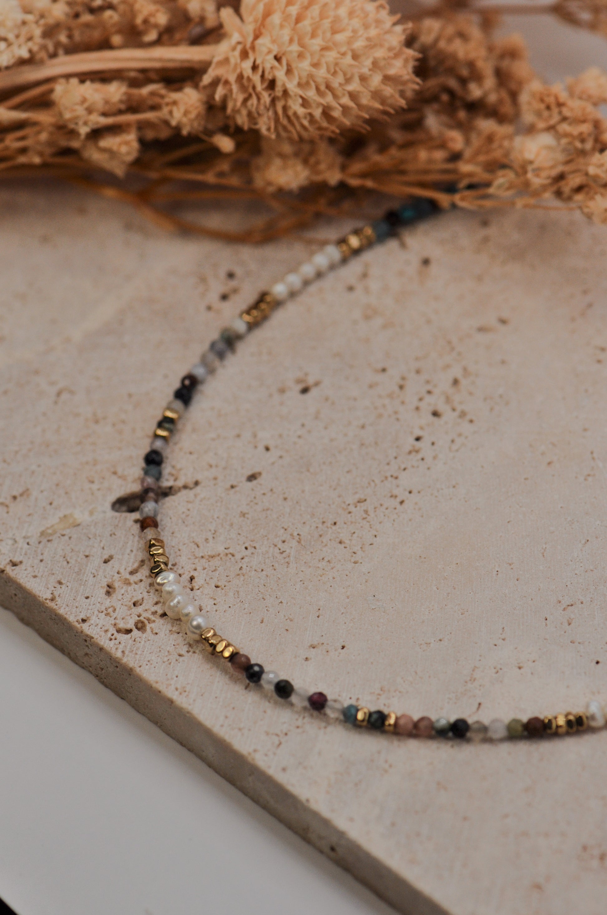 Le collier Bora est orné de perles d'eau douce, de véritables pierres naturelles et de perles en acier inoxydable. L'alliage parfait pour sublimer vos tenues.