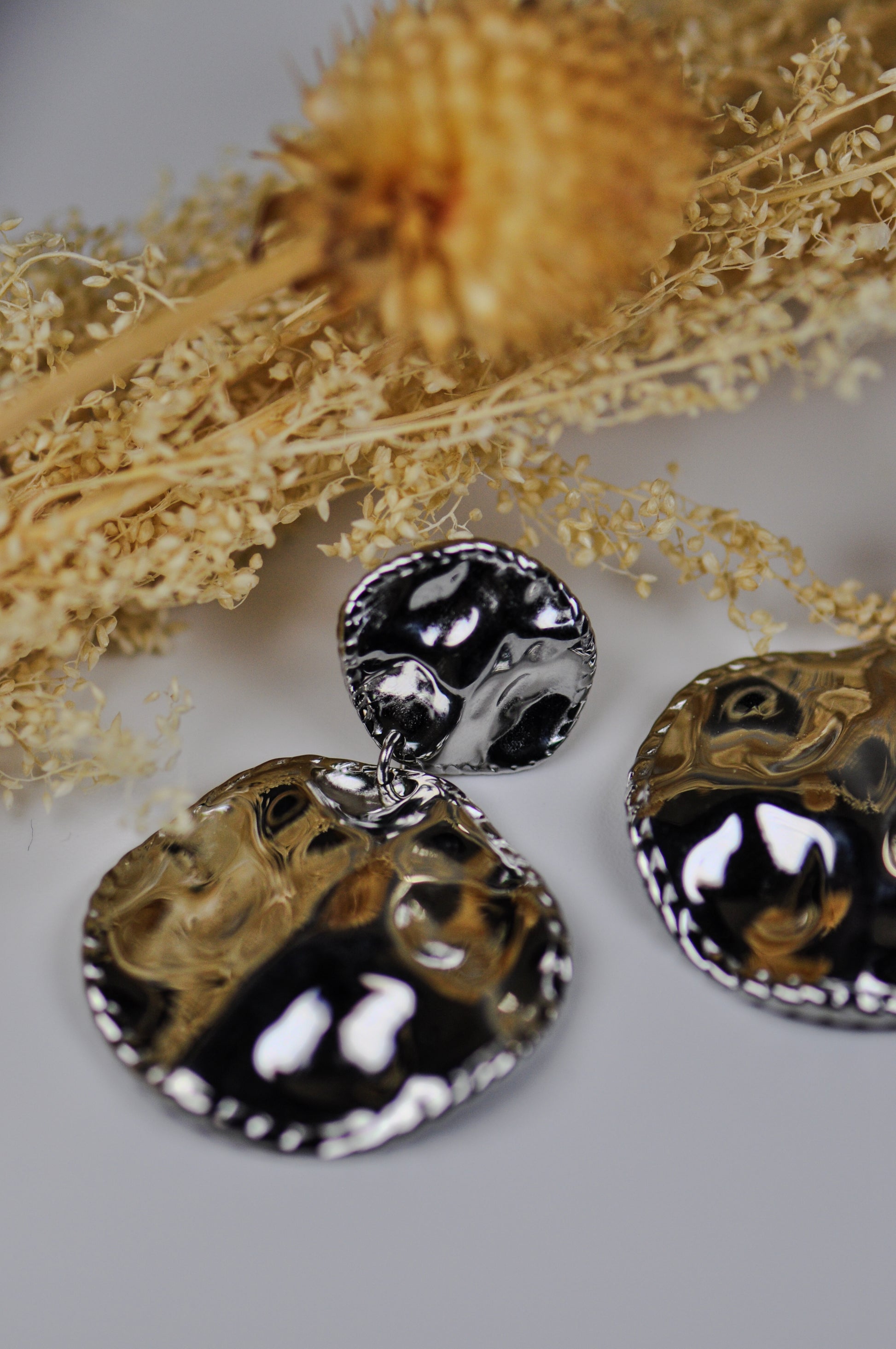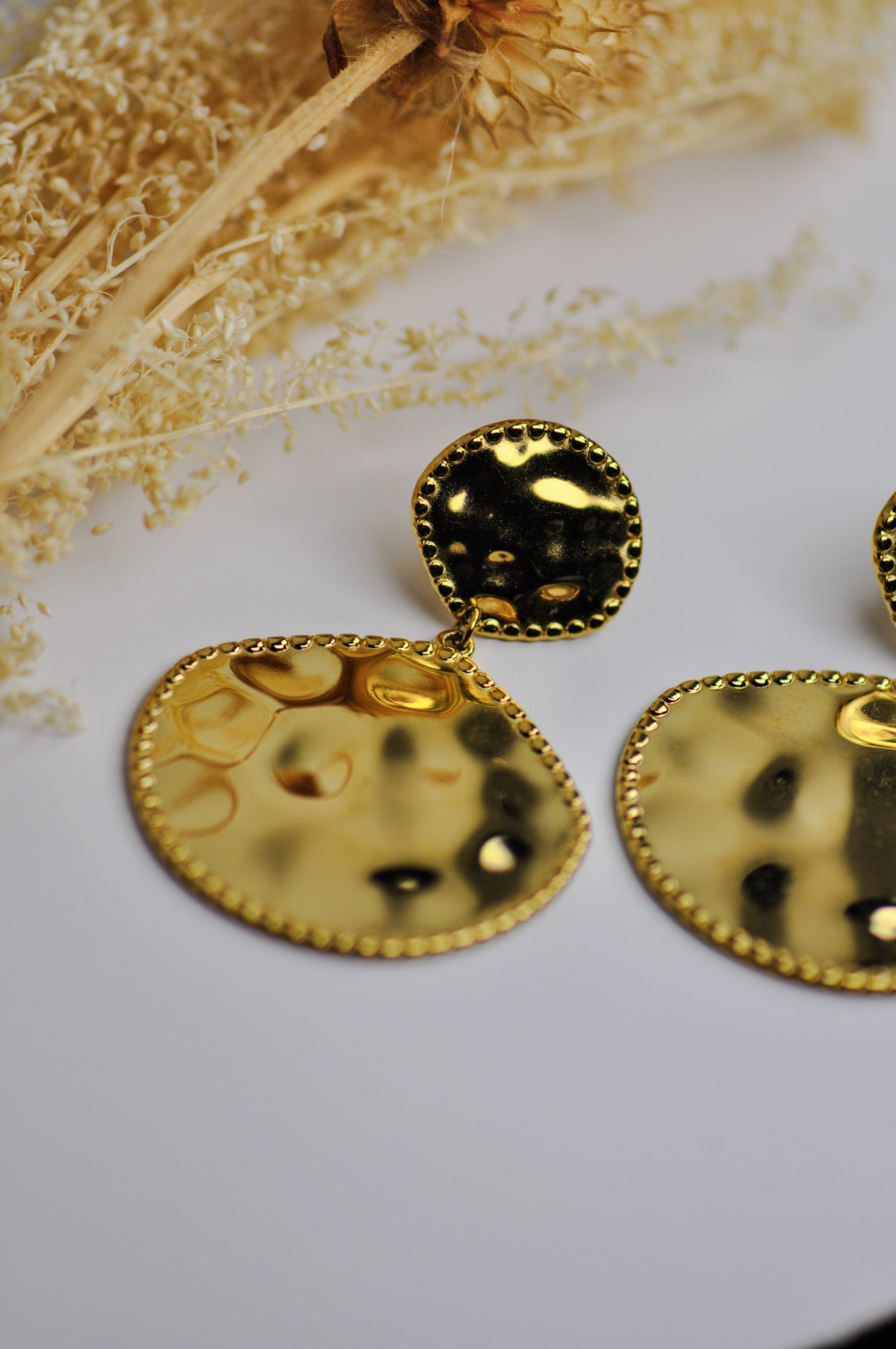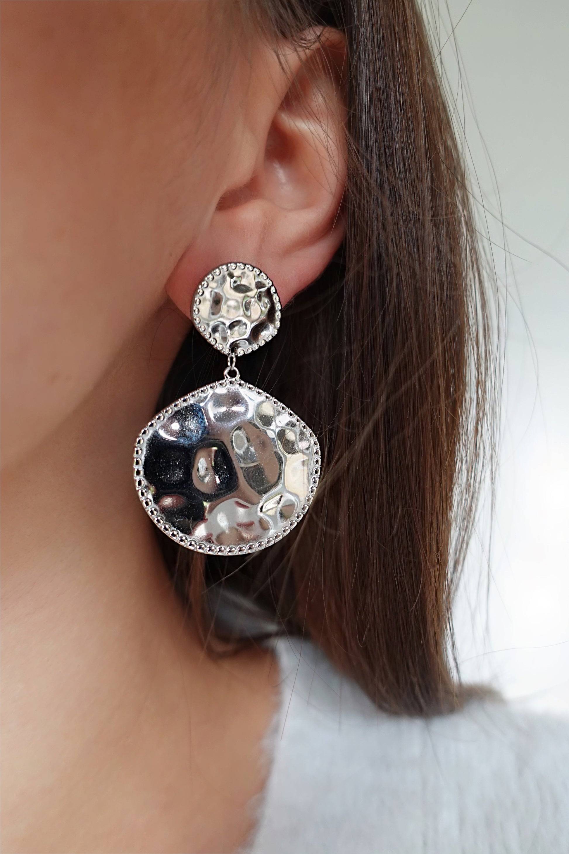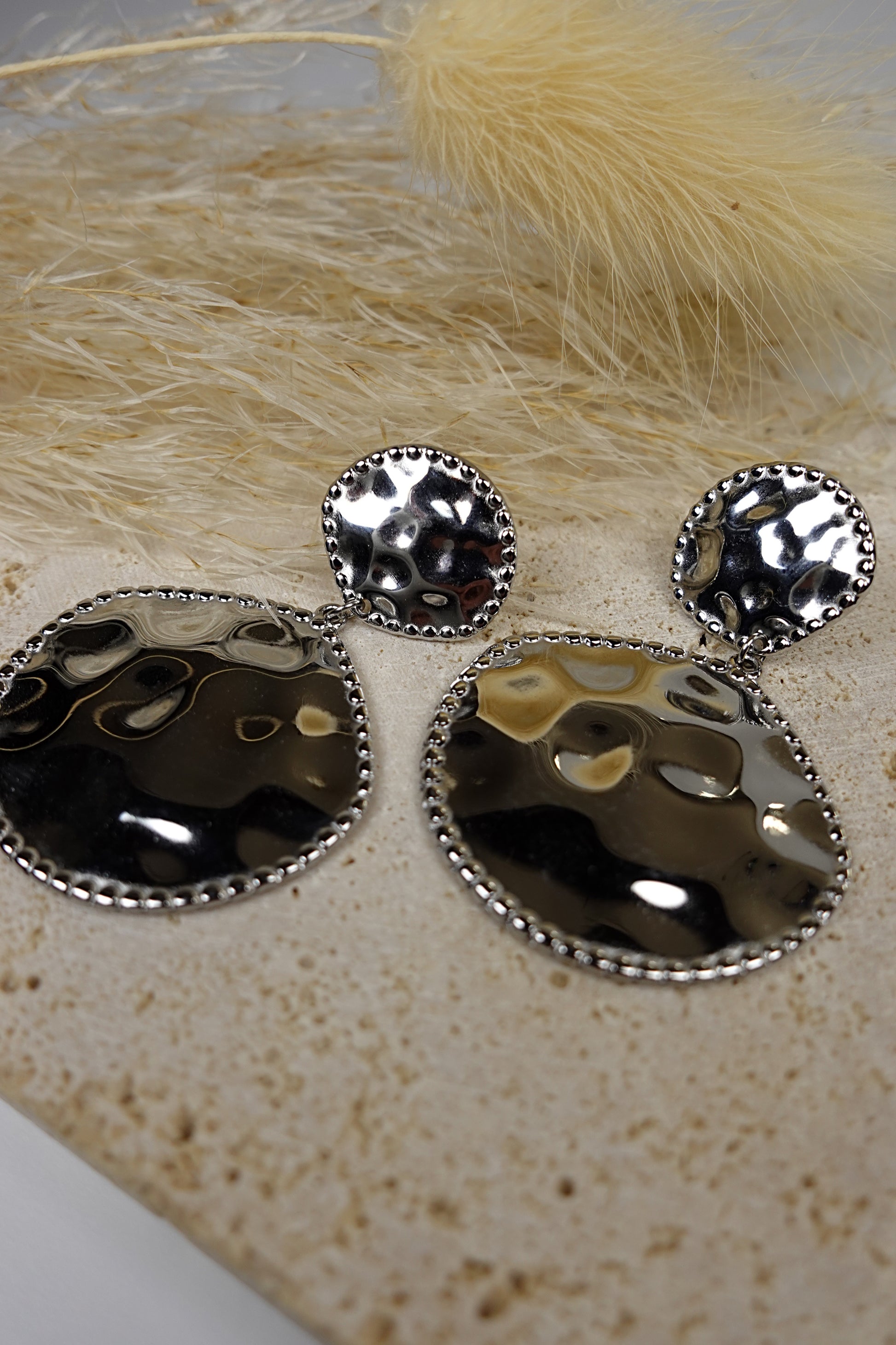 Les boucles Mala en acier inoxydable sont élégantes avec leurs effets martelés. Tous nos bijoux résistent à l'eau, au soleil et ne rouillent pas dans le temps.