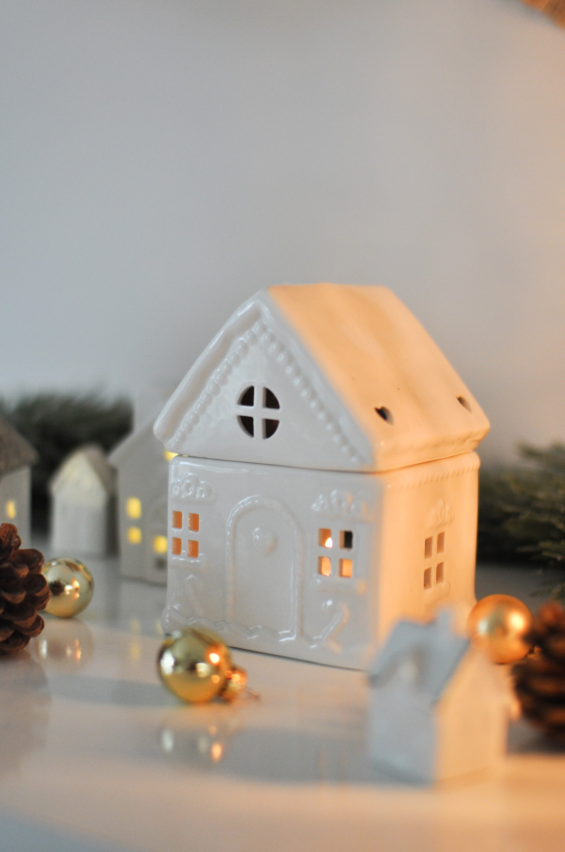 Ce brûle-parfum en forme de petite maison de pain d'épices apportera une touche féérique et festive à votre décoration intérieure. Conçu en céramique blanche avec des détails délicats, il diffuse une douce lumière à travers ses fenêtres et sa porte ajourées, créant une ambiance chaleureuse et cosy, parfaite pour la période de Noël.