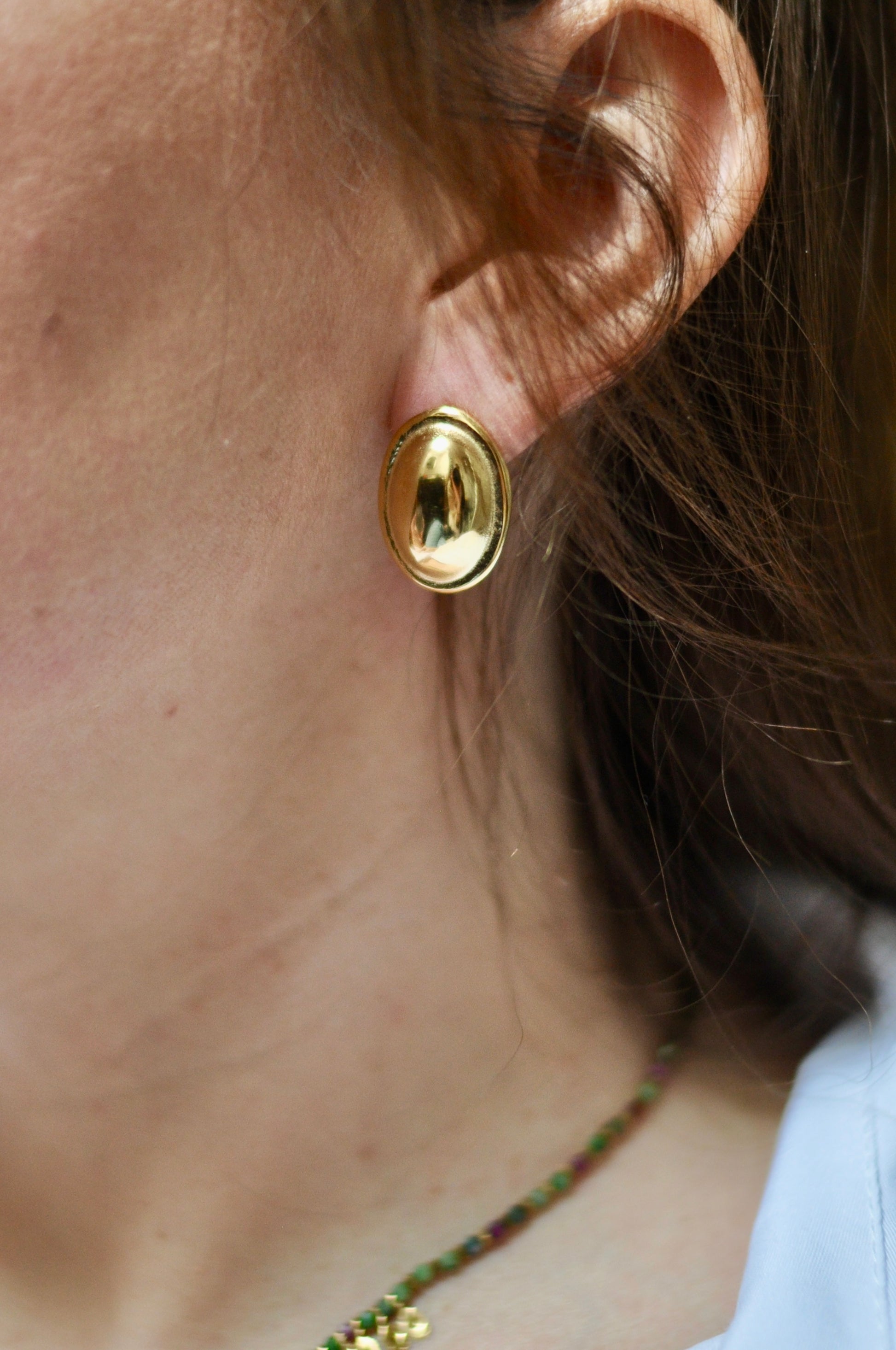 Épurées et lumineuses, les boucles d’oreilles Esmée incarnent l’élégance intemporelle. Leur forme ovale légèrement bombée capte délicatement la lumière, offrant un éclat doux et raffiné.