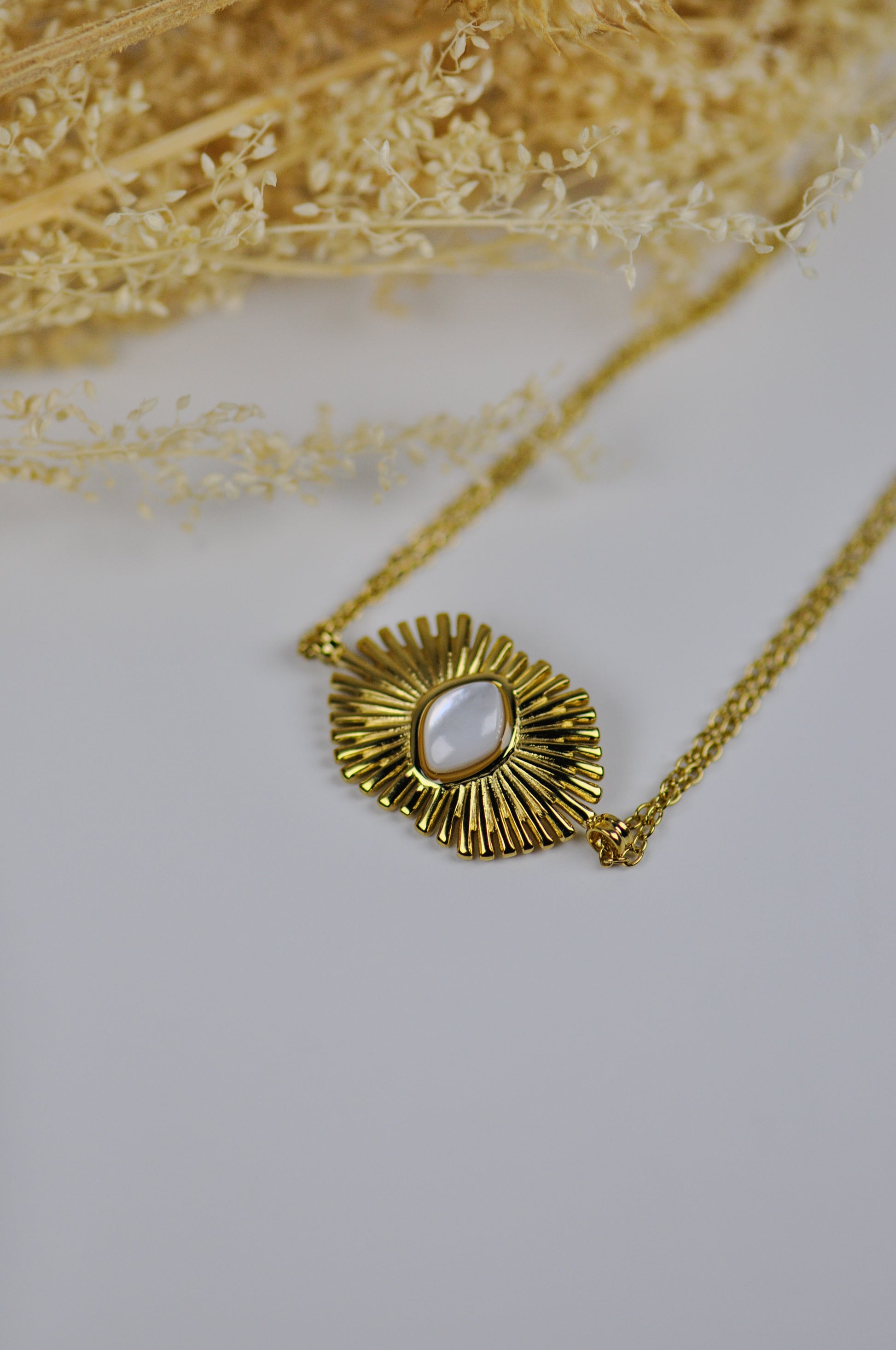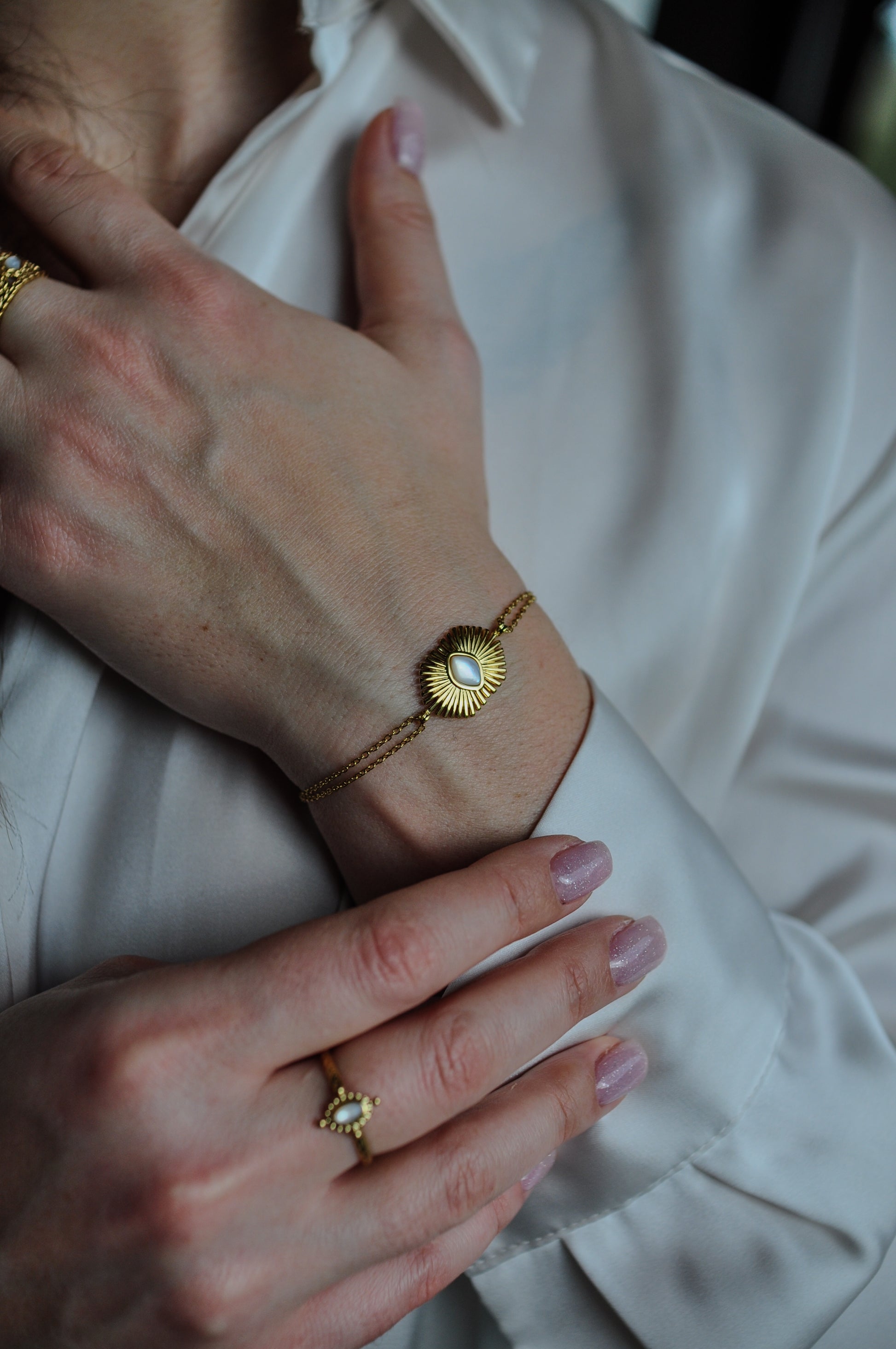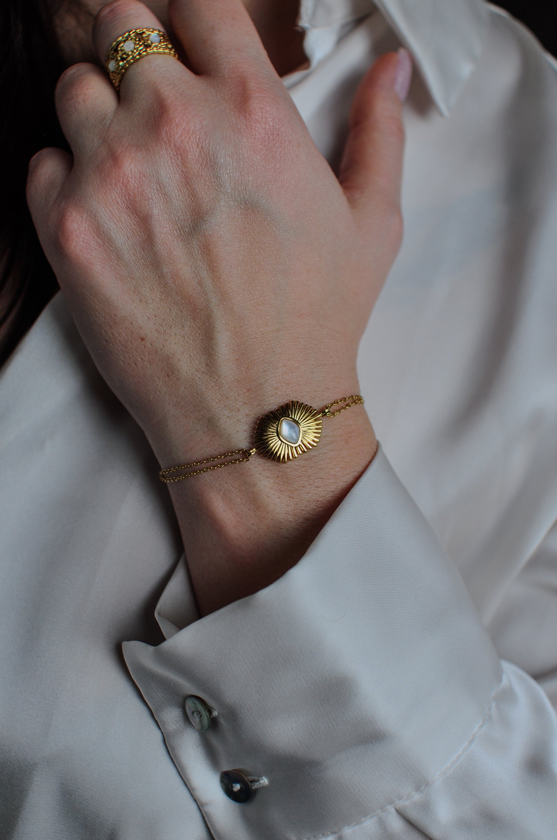 Bracelet en acier inoxydable à double rangs composé d'une pierre naturelle en Nacre. Tous nos bijoux résistent à l'eau, au soleil et ne rouillent pas dans le temps.