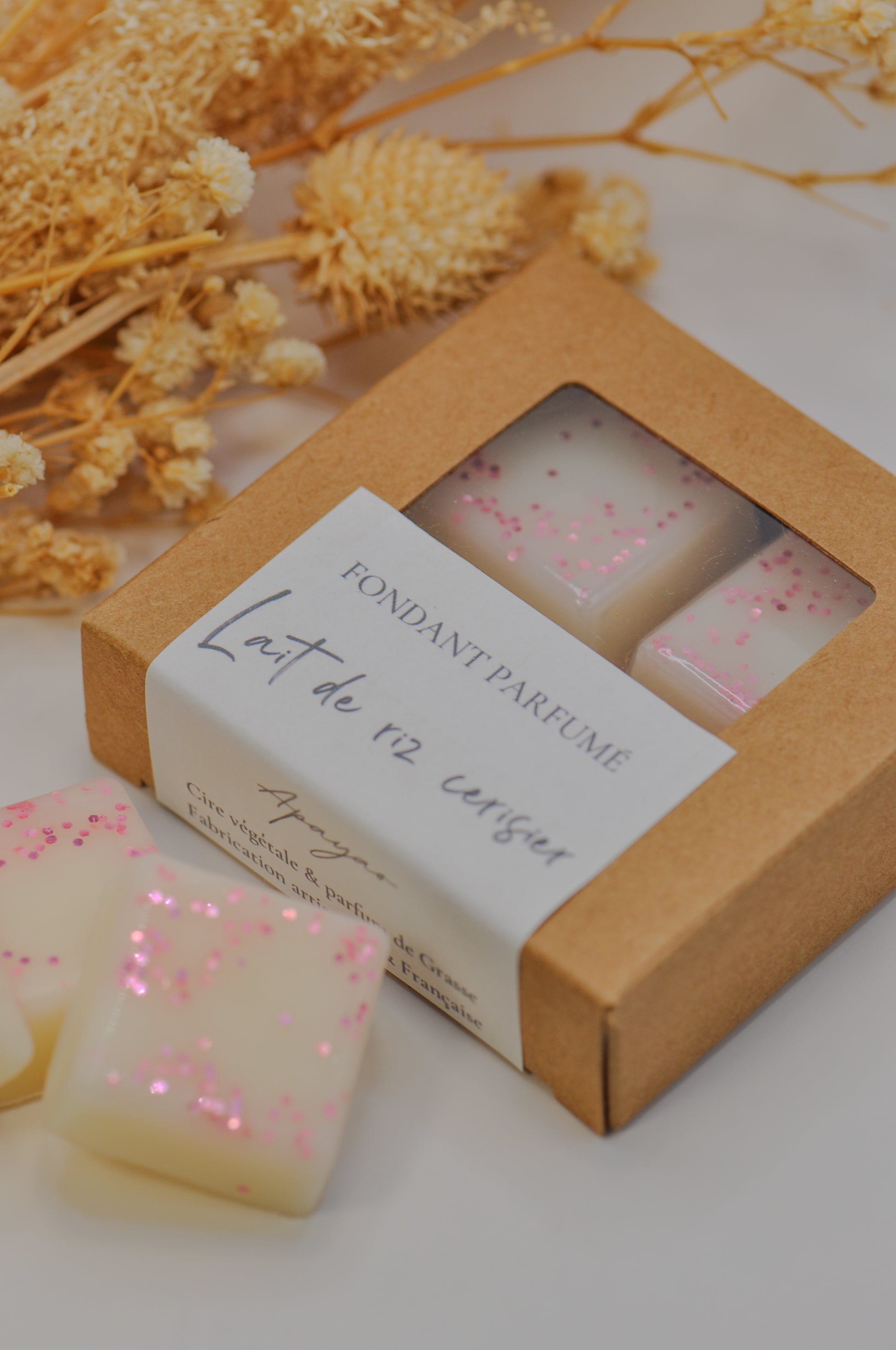 Laissez-vous emporter par la douceur et la légèreté de notre fondant parfumé à la senteur lait de riz cerisier à faire fondre dans un brûle-parfum. Il est composé de cire végétale d'olive et est parfumé par des fragrances issues de Grasse sélectionnées par nos soins.
