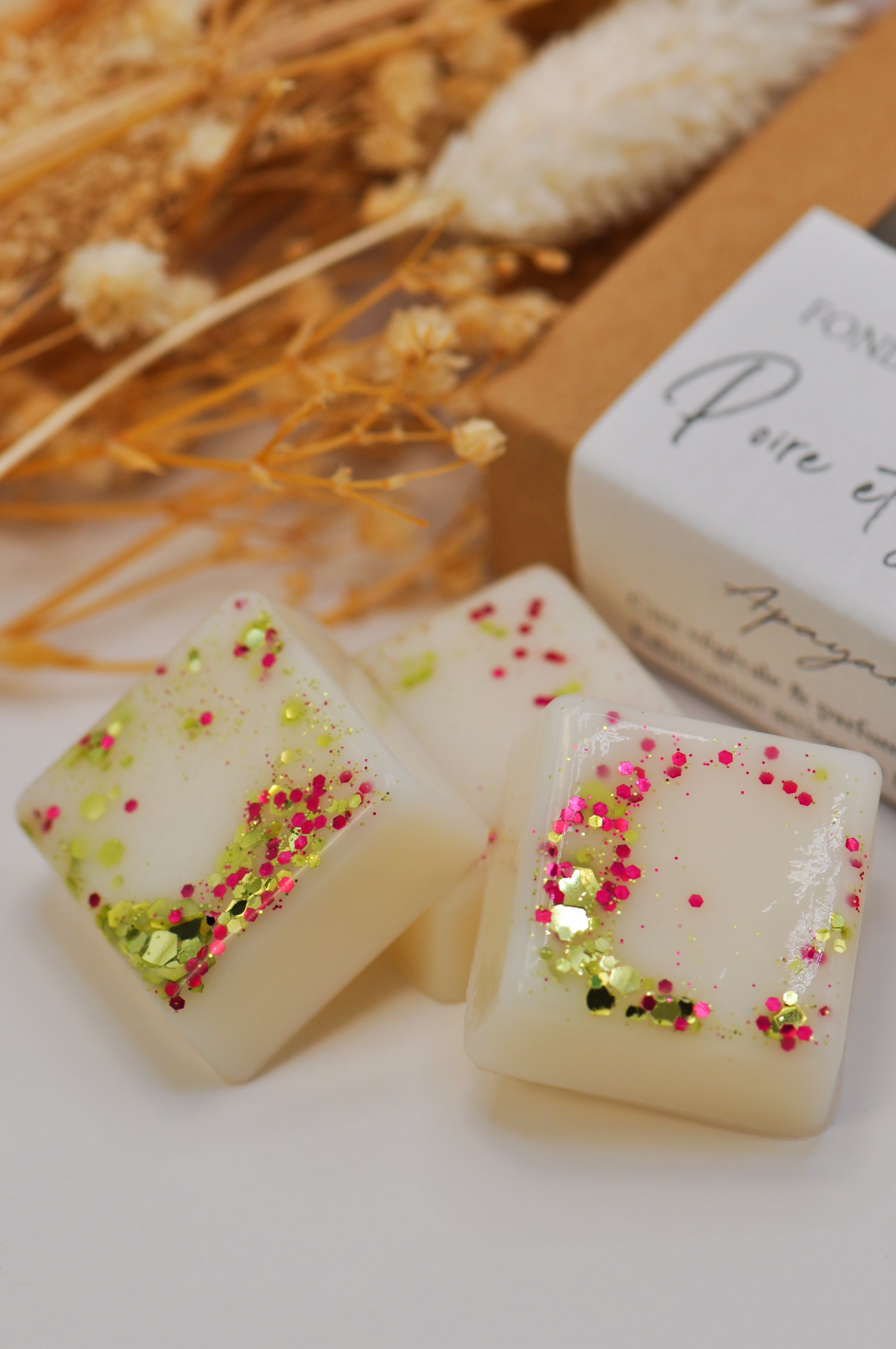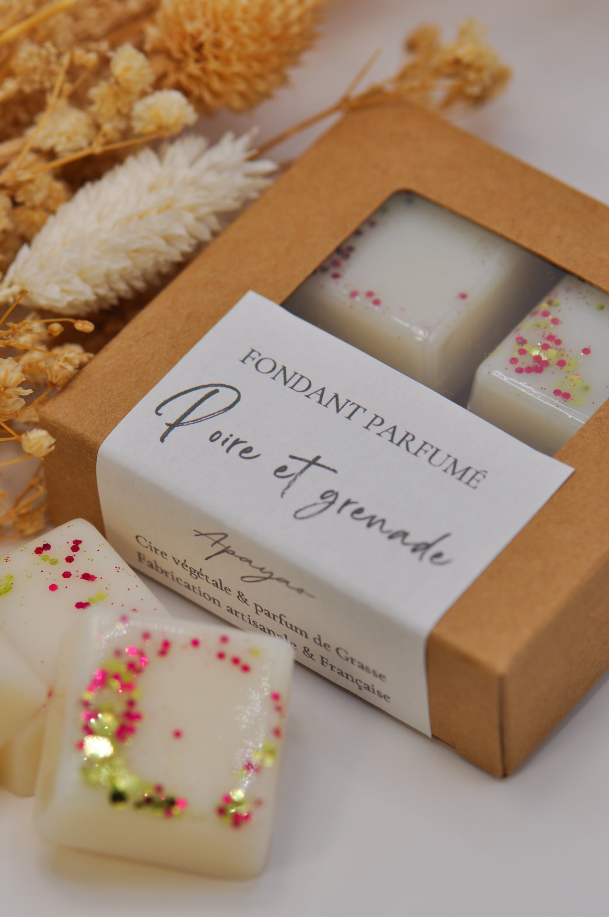 Offrez à vos sens une expérience unique avec notre fondant Poire et Grenade, alliant la douceur sucrée de la poire et l'acidité délicate de la grenade à faire fondre dans un brûle-parfum. Il est composé de cire végétale d'olive et est parfumé par des fragrances issues de Grasse sélectionnées par nos soins.