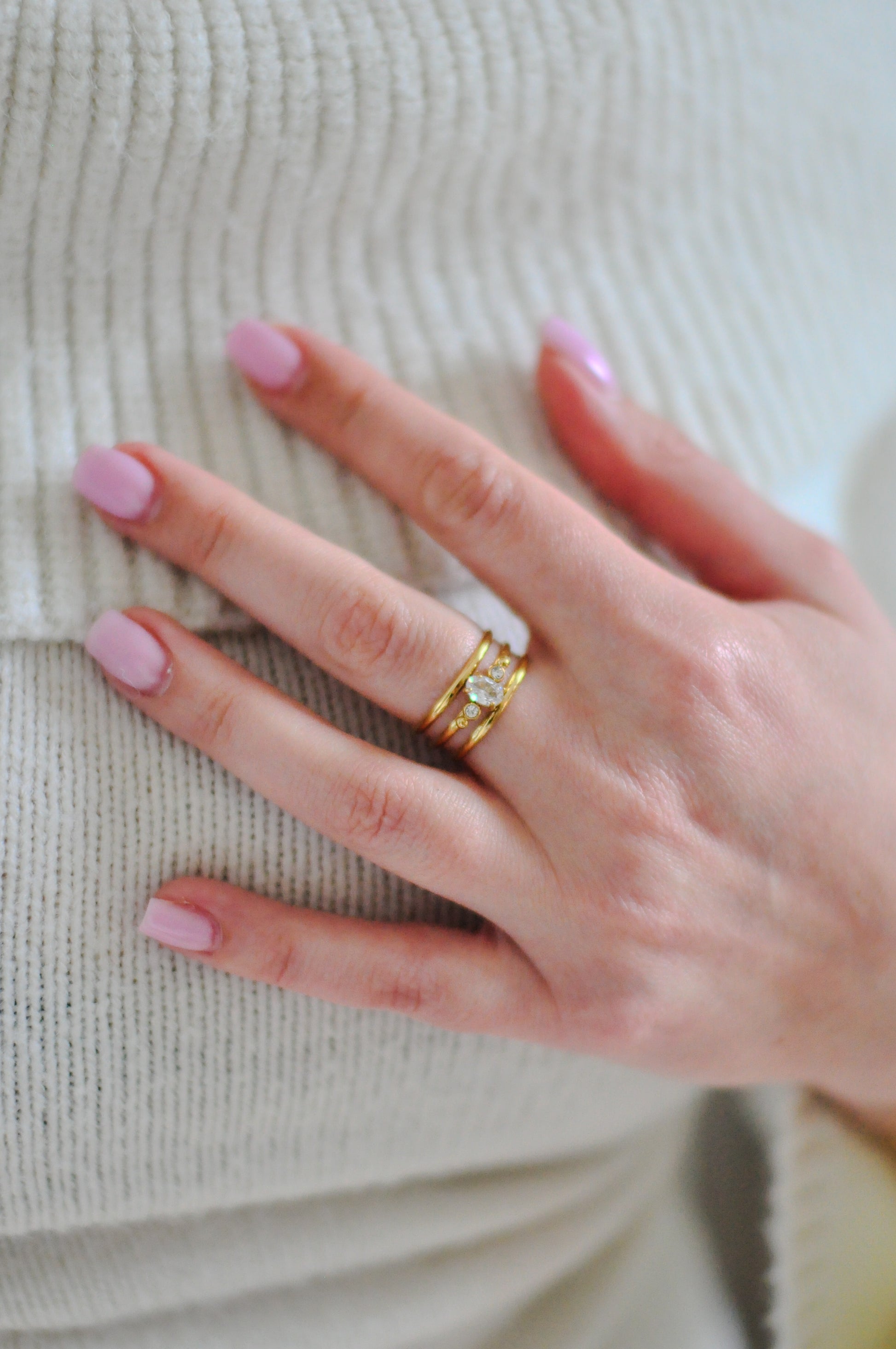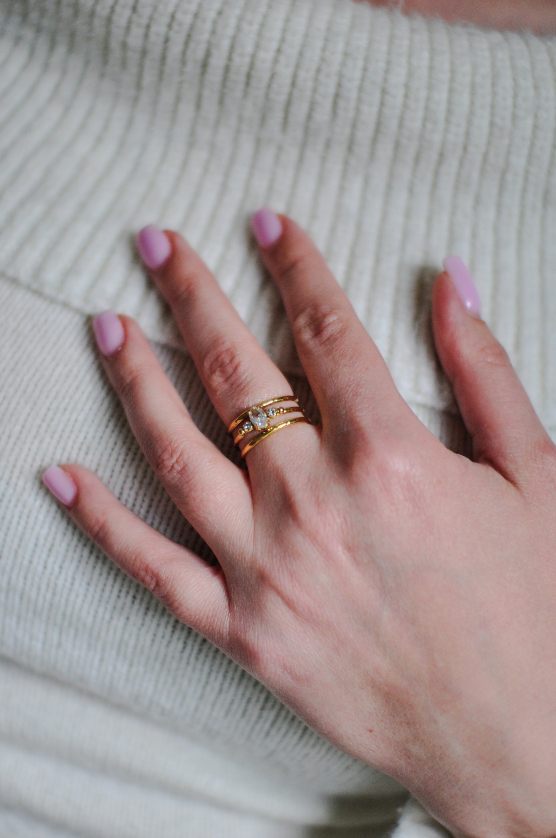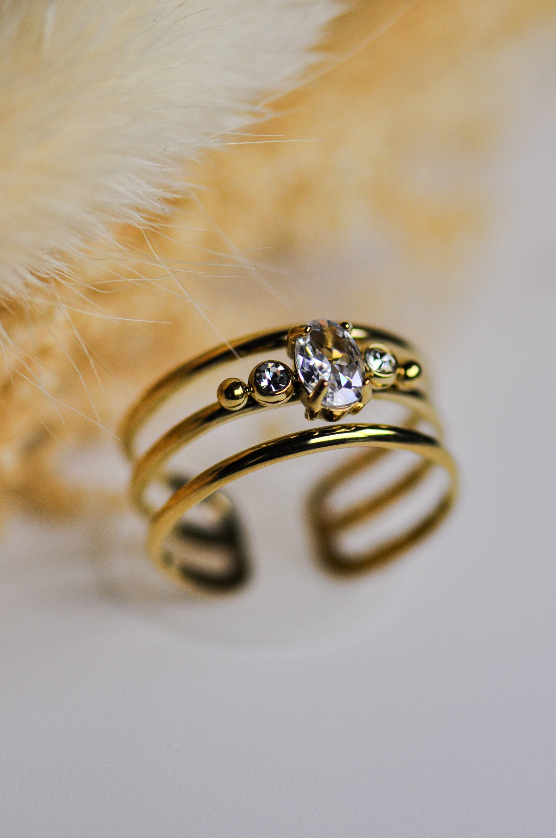 Bague triple rangs en acier inoxydable composée de véritables zircons. Lumineuse et élégante, elle sublimera toutes vos tenues.