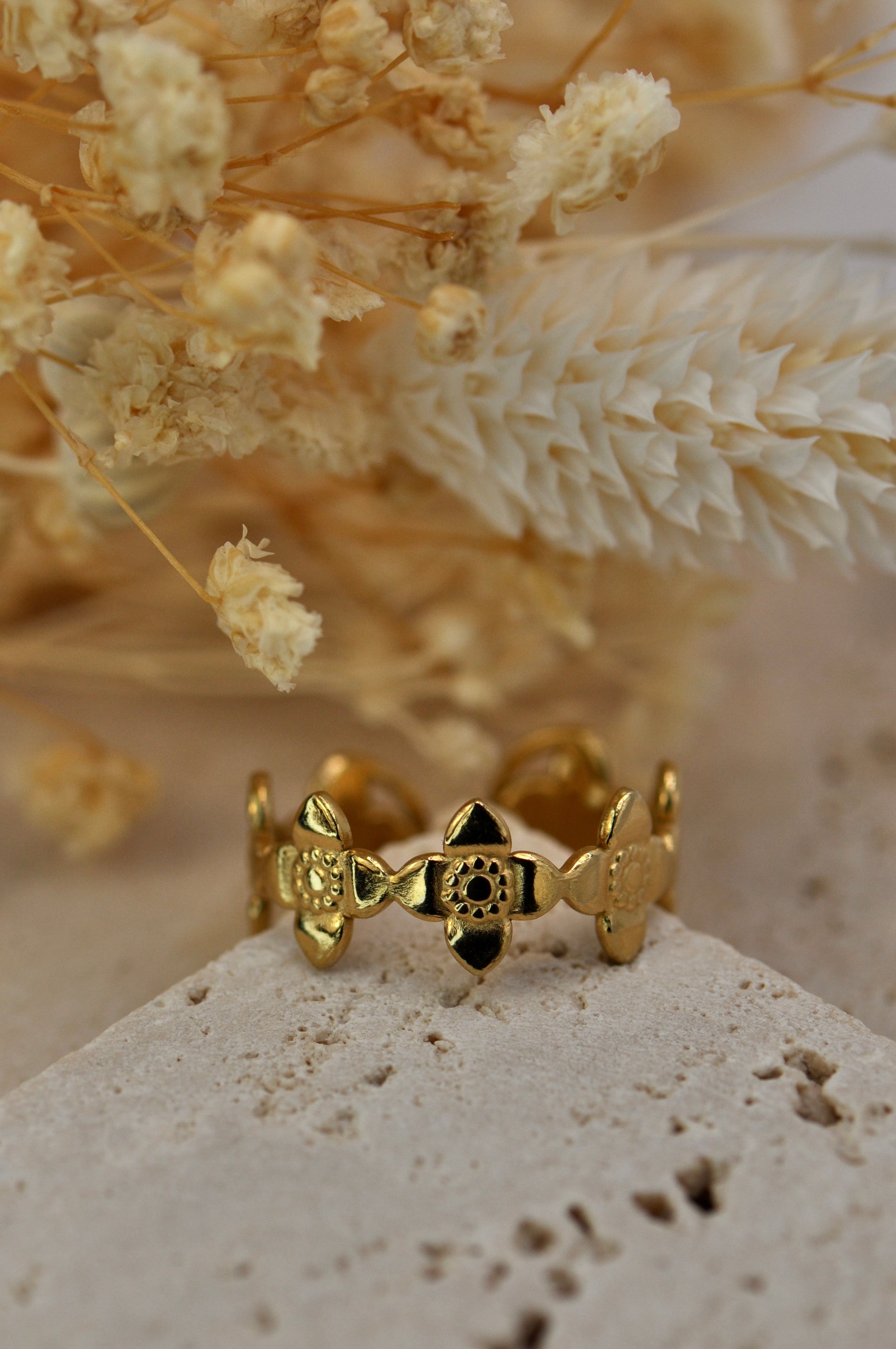 Bague en acier ornée de fleurs. Tous nos bijoux résistent à l'eau, au soleil et ne rouillent pas dans le temps.