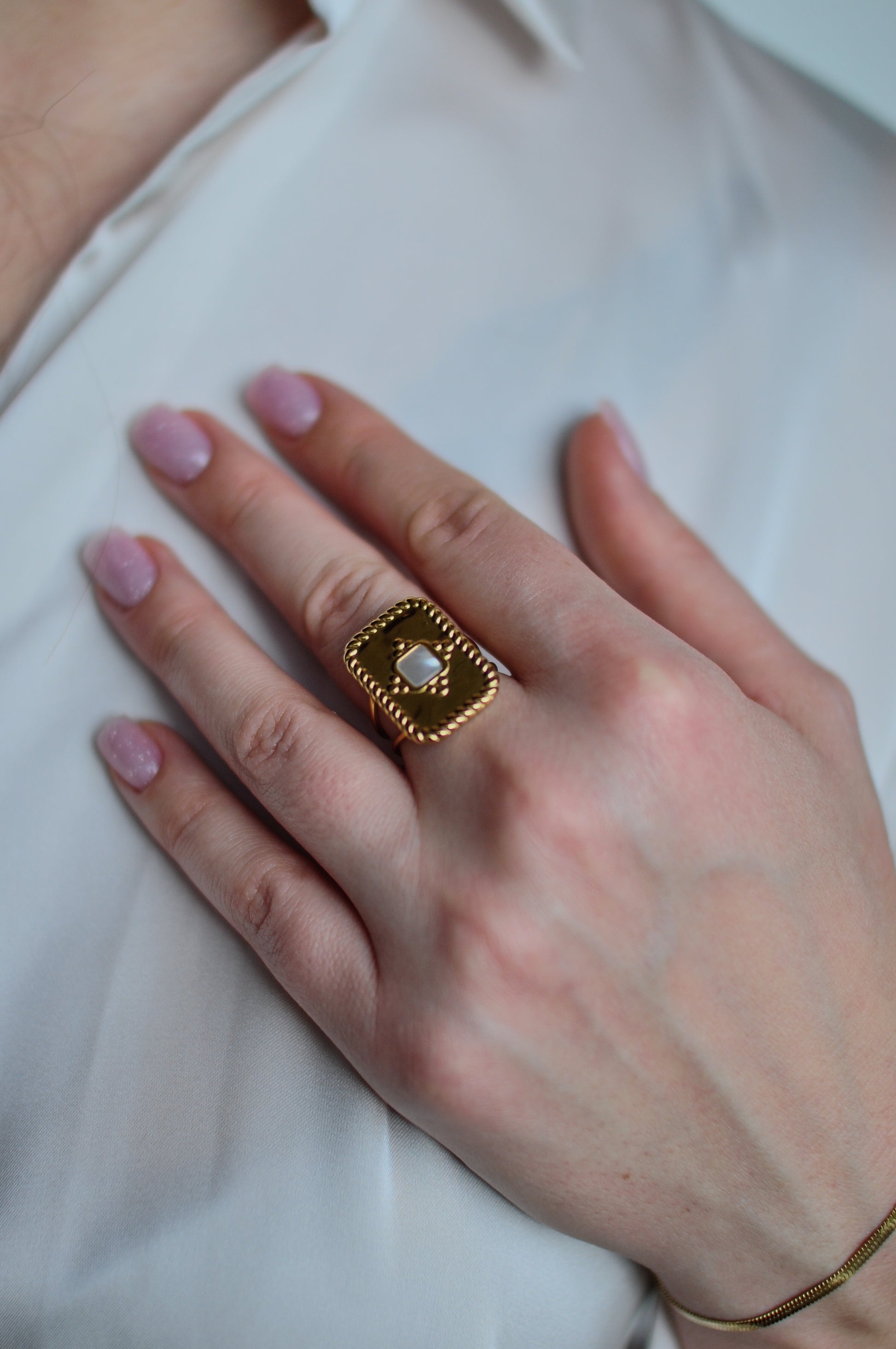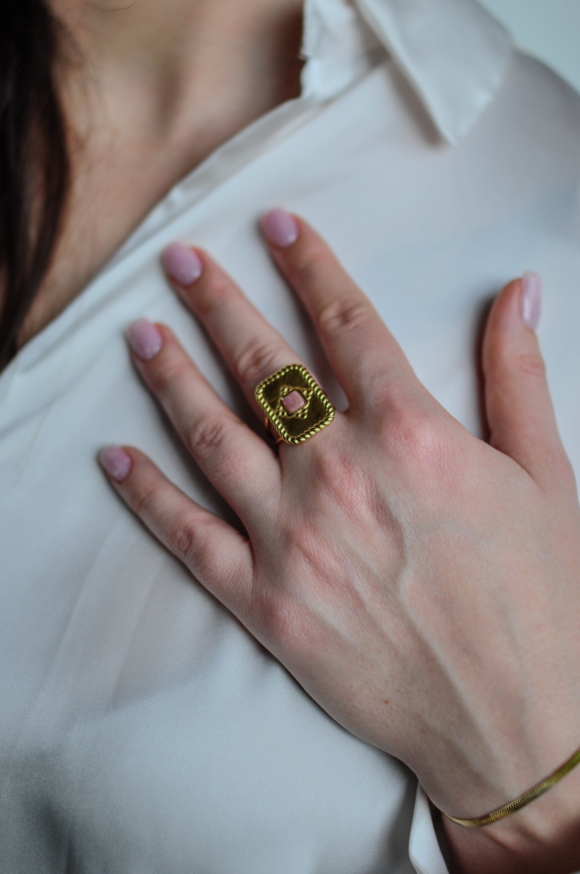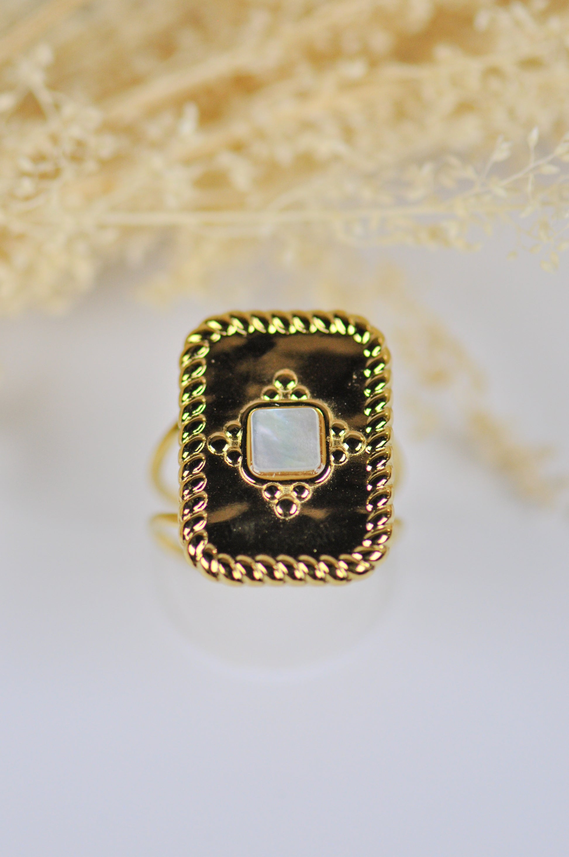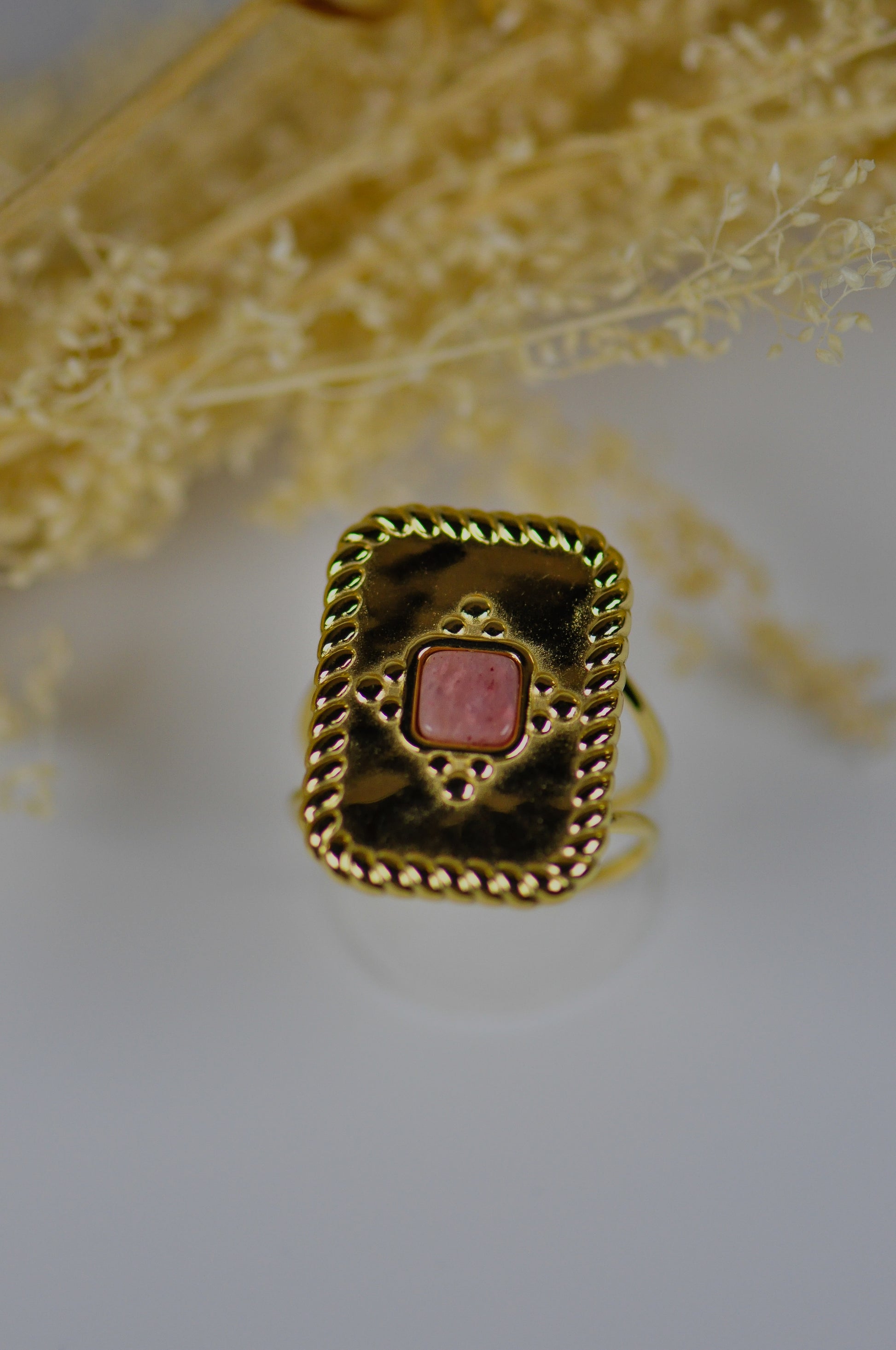 Bague ajustable en acier inoxydable composée d'une plaque martelé ornée d'une pierre naturelle. Tous nos bijoux résistent à l'eau, au soleil et ne rouillent pas dans le temps.