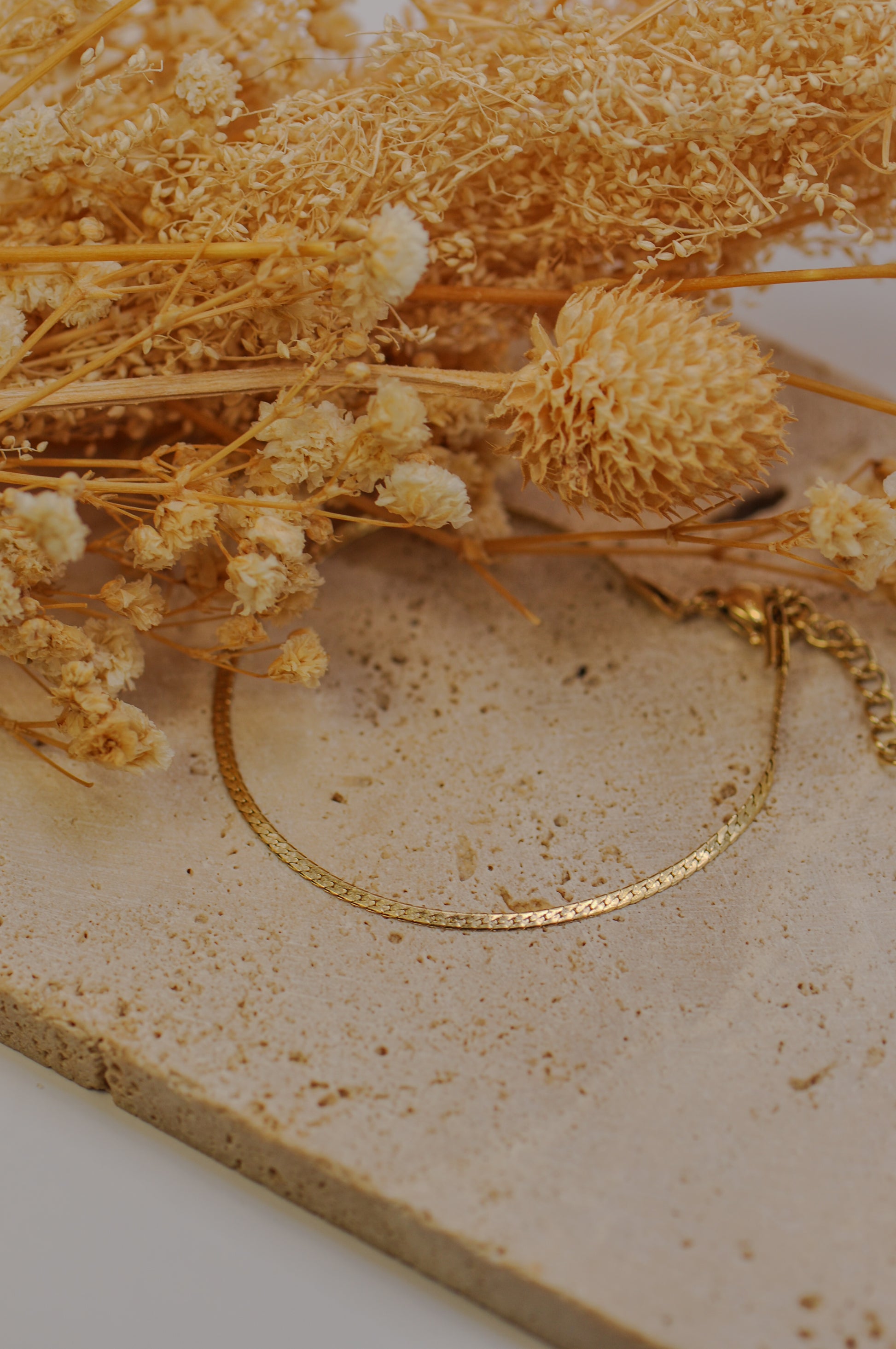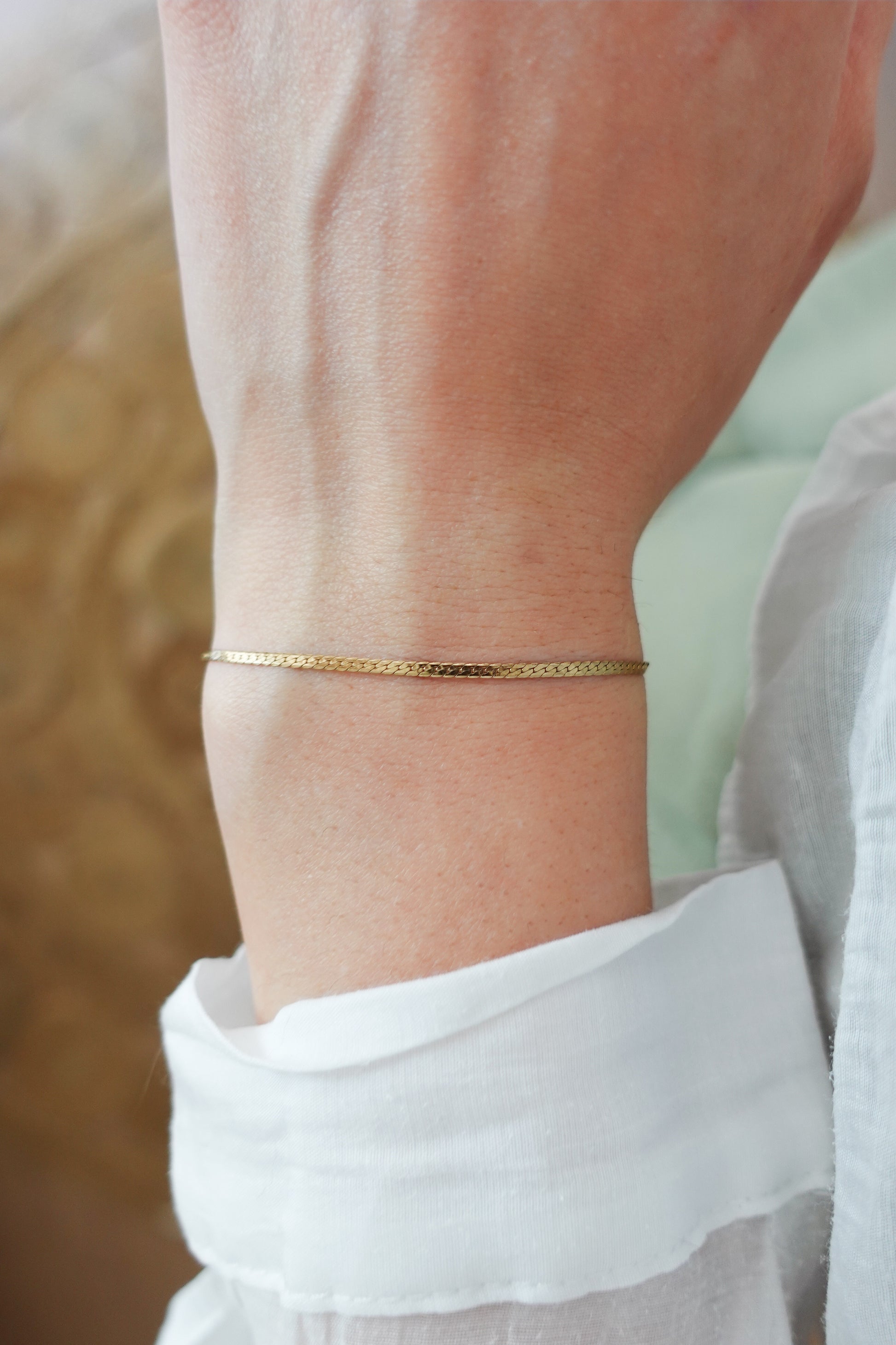 Bracelet en acier inoxydable composé d'une fine maille plaque type miroir. Le bracelet Timéa s'accorde avec tous les bijoux.