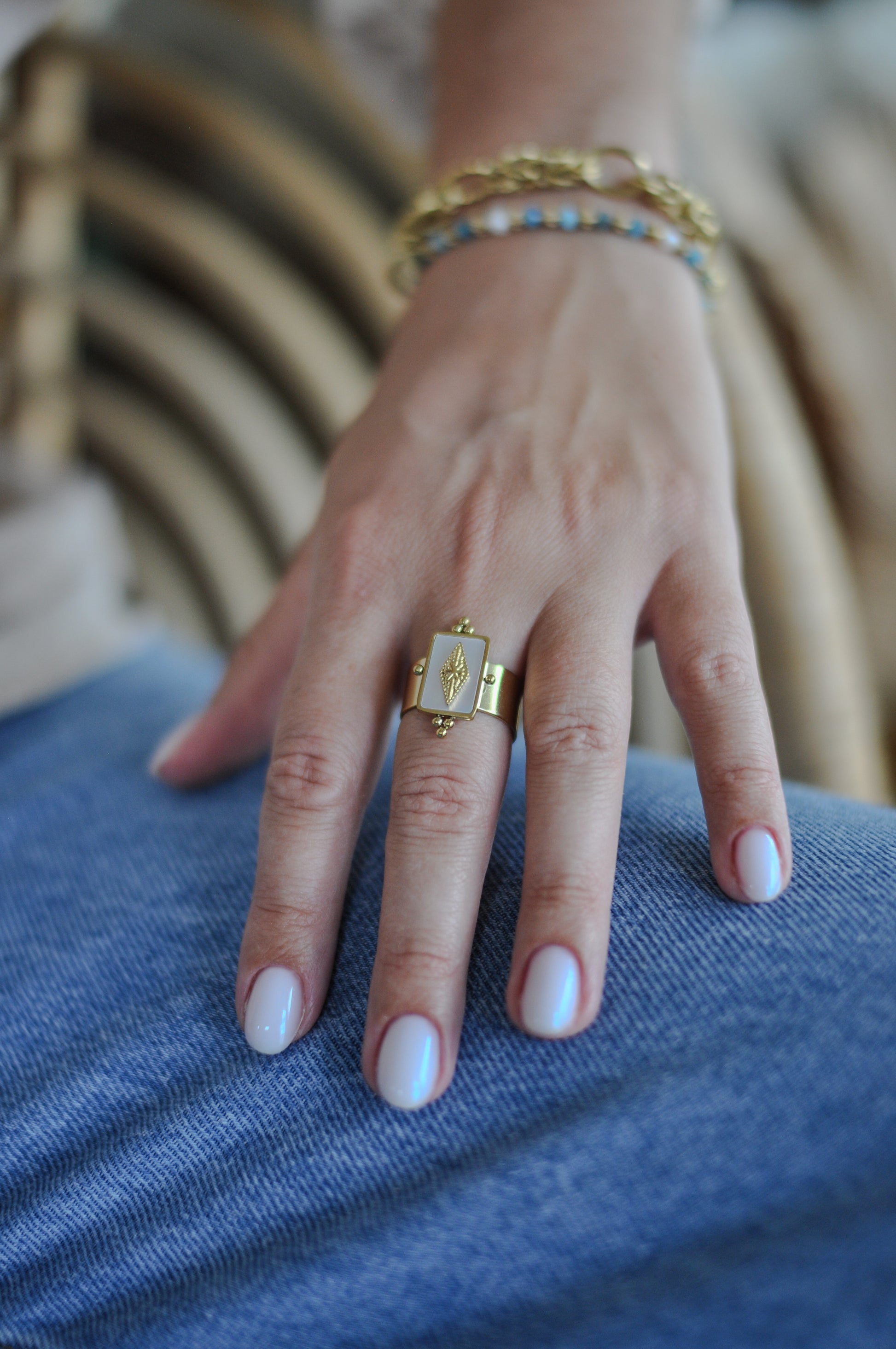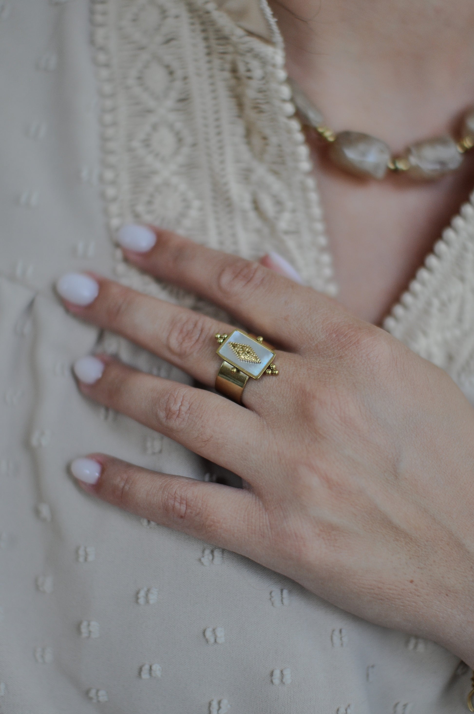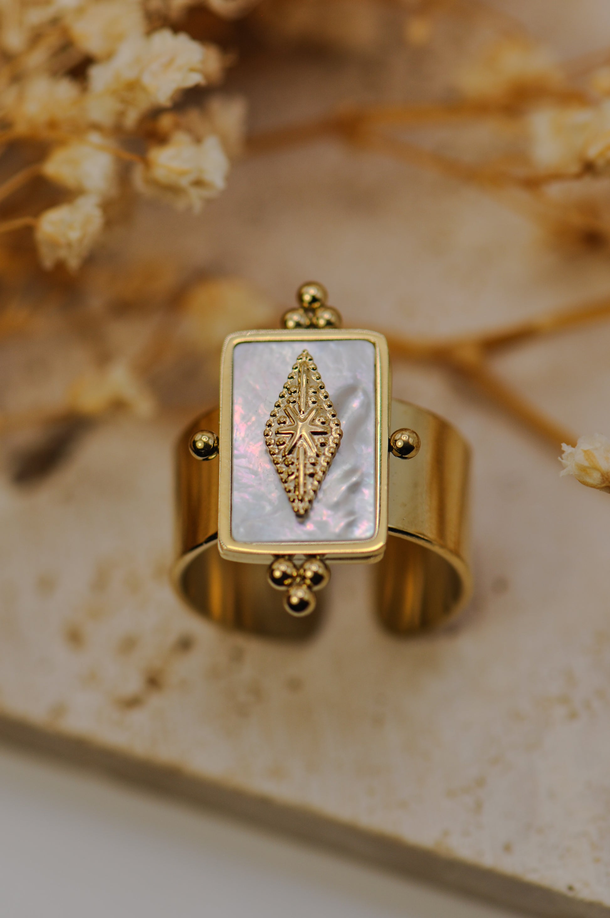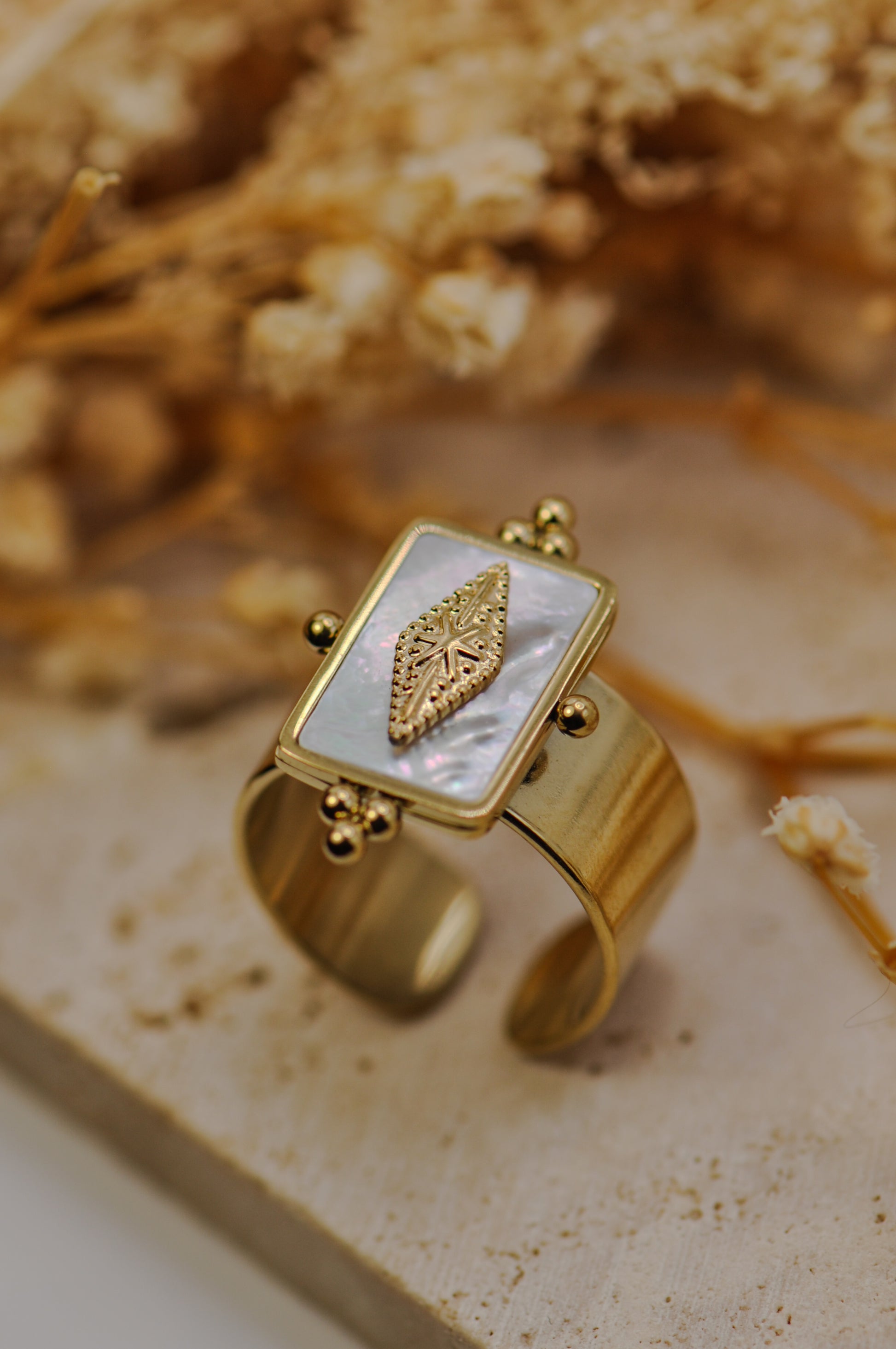 Bague ajustable en acier inoxydable. La bague Moa est la bague bohème de notre nouvelle collection. Lumineuse avec sa pierre de Nacre, elle saura s'accorder avec vos tenues estivales.