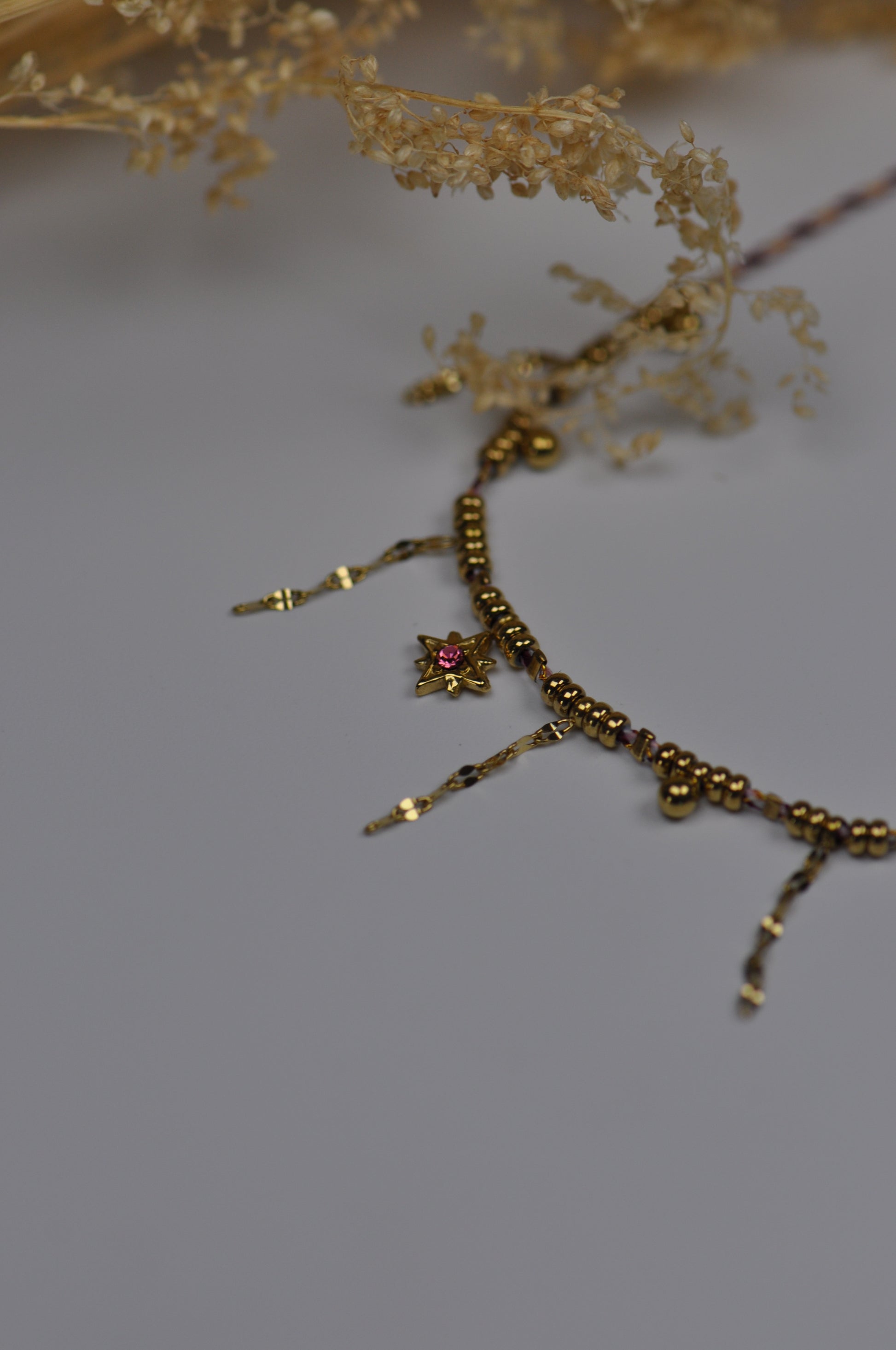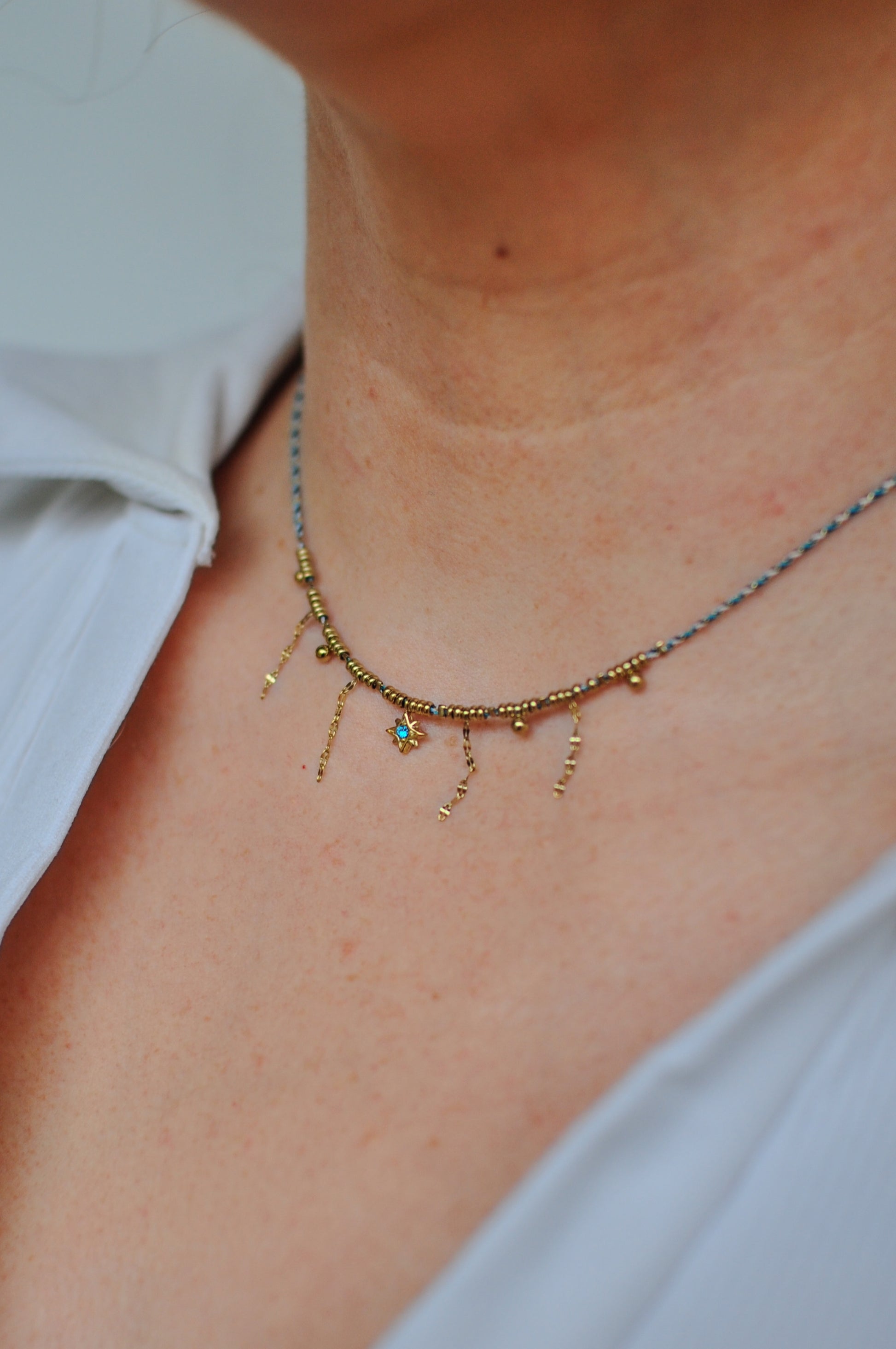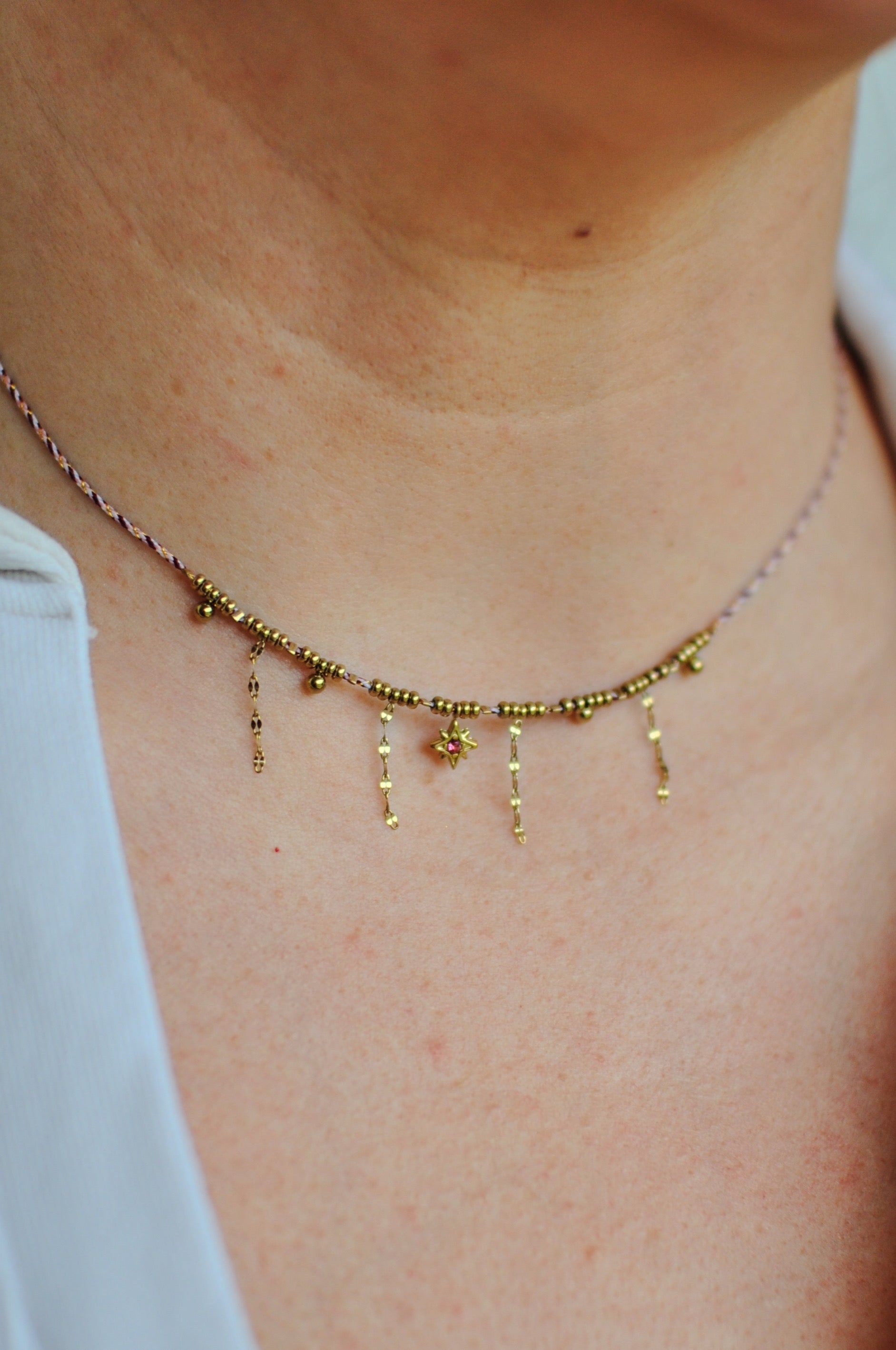 Collier sur cordon composé de petites chaînes pendantes et d'une étoile sertie d'un oxyde de zirconium.Tous nos bijoux résistent à l'eau, au soleil et ne rouillent pas dans le temps.