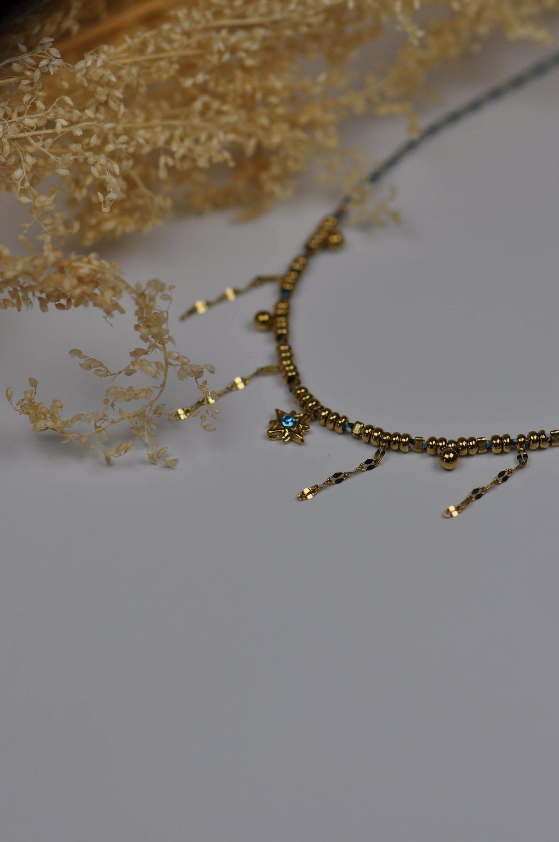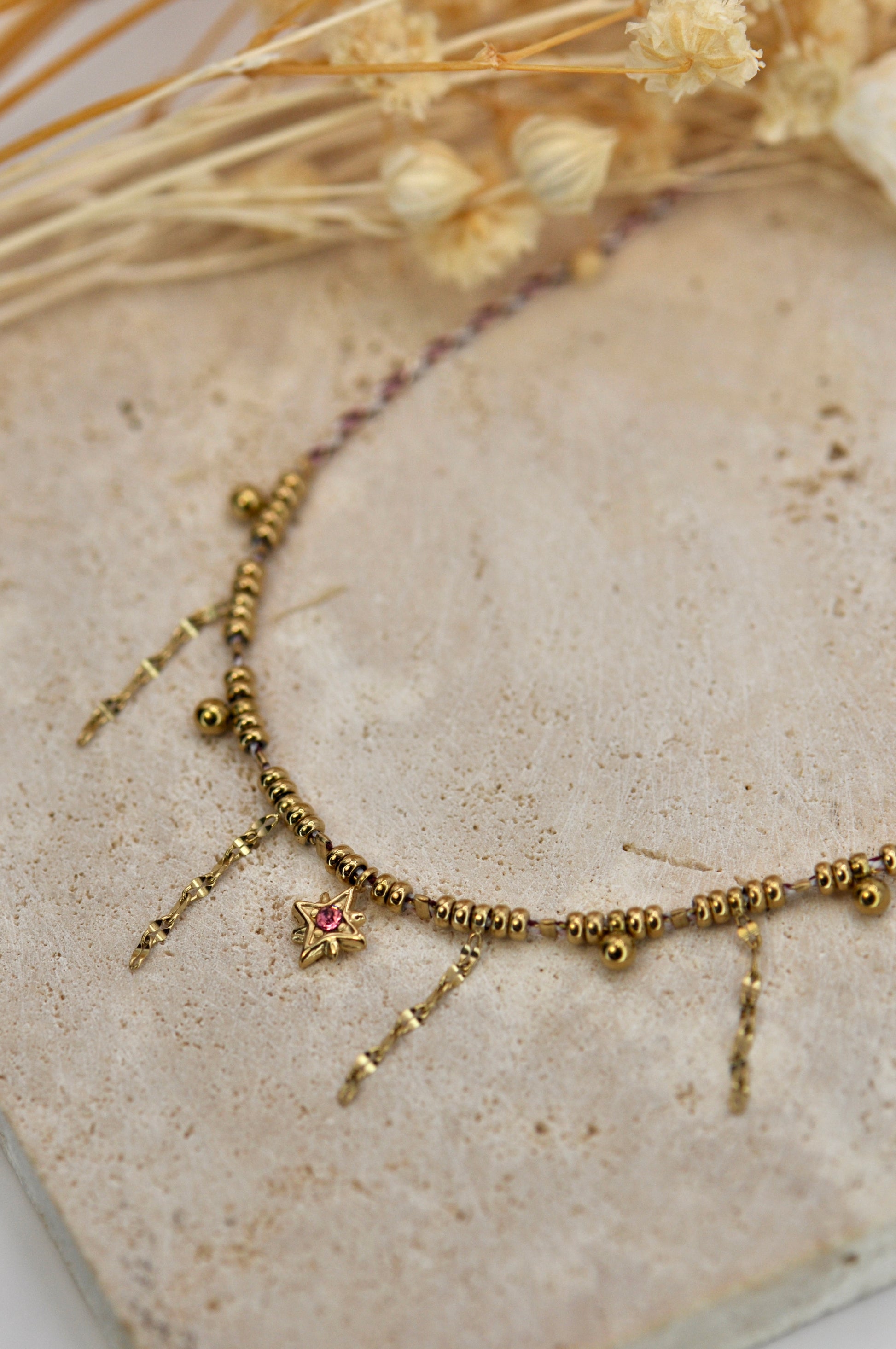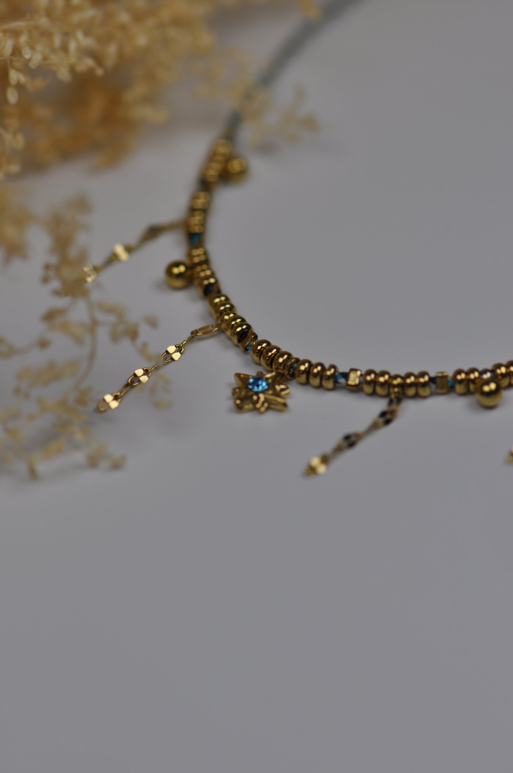 Collier sur cordon composé de petites chaînes pendantes et d'une étoile sertie d'un oxyde de zirconium.Tous nos bijoux résistent à l'eau, au soleil et ne rouillent pas dans le temps.
