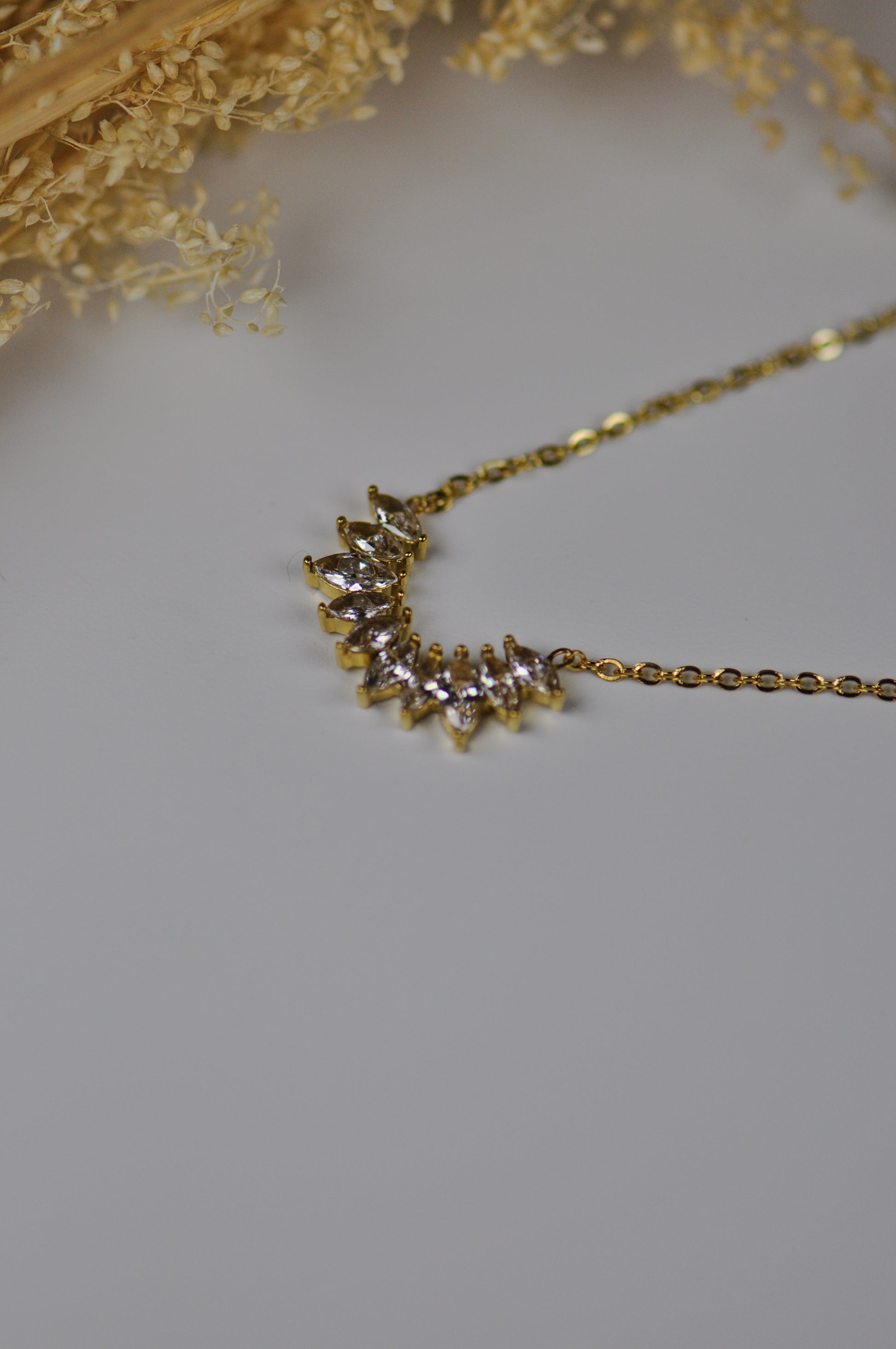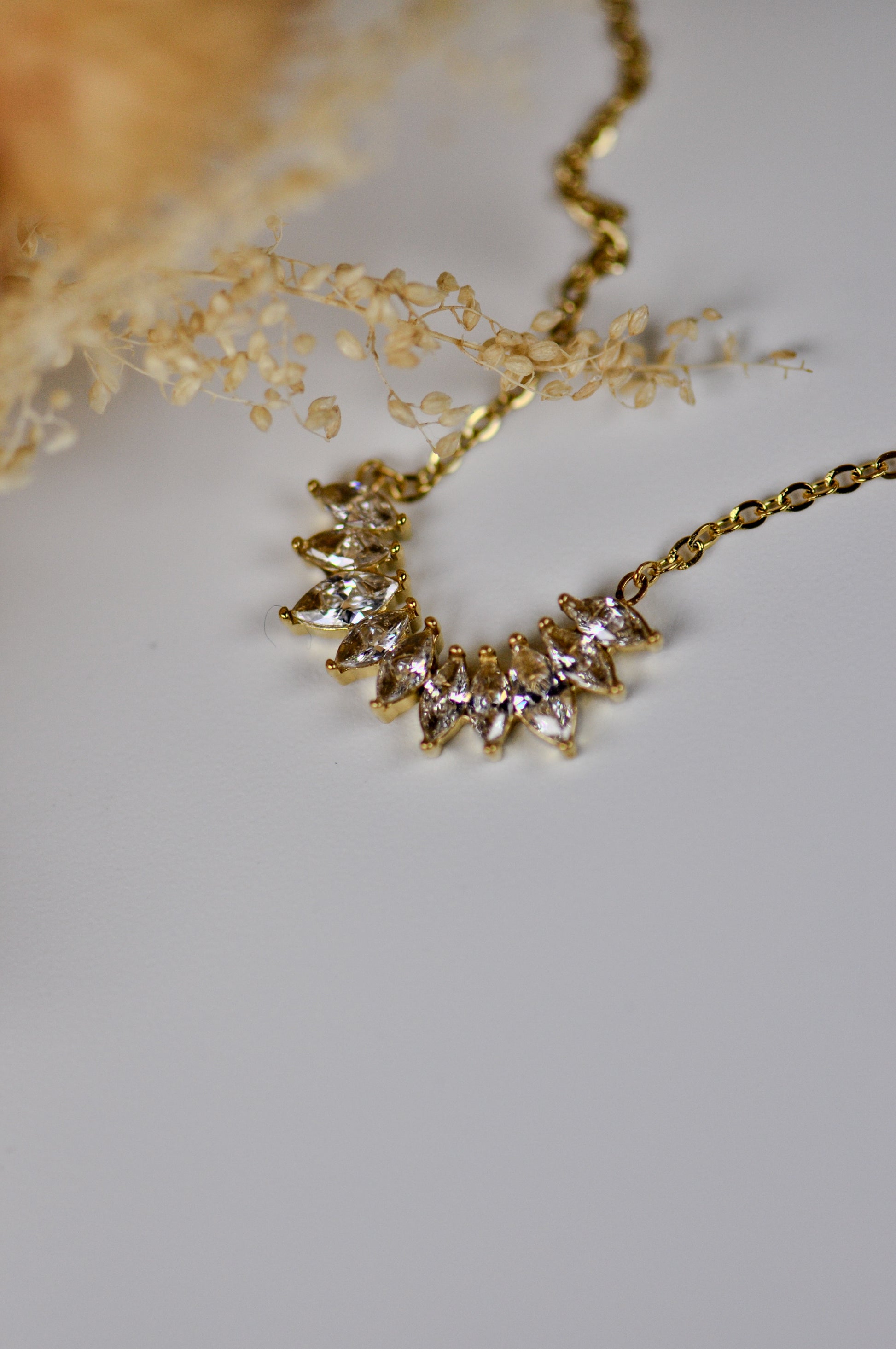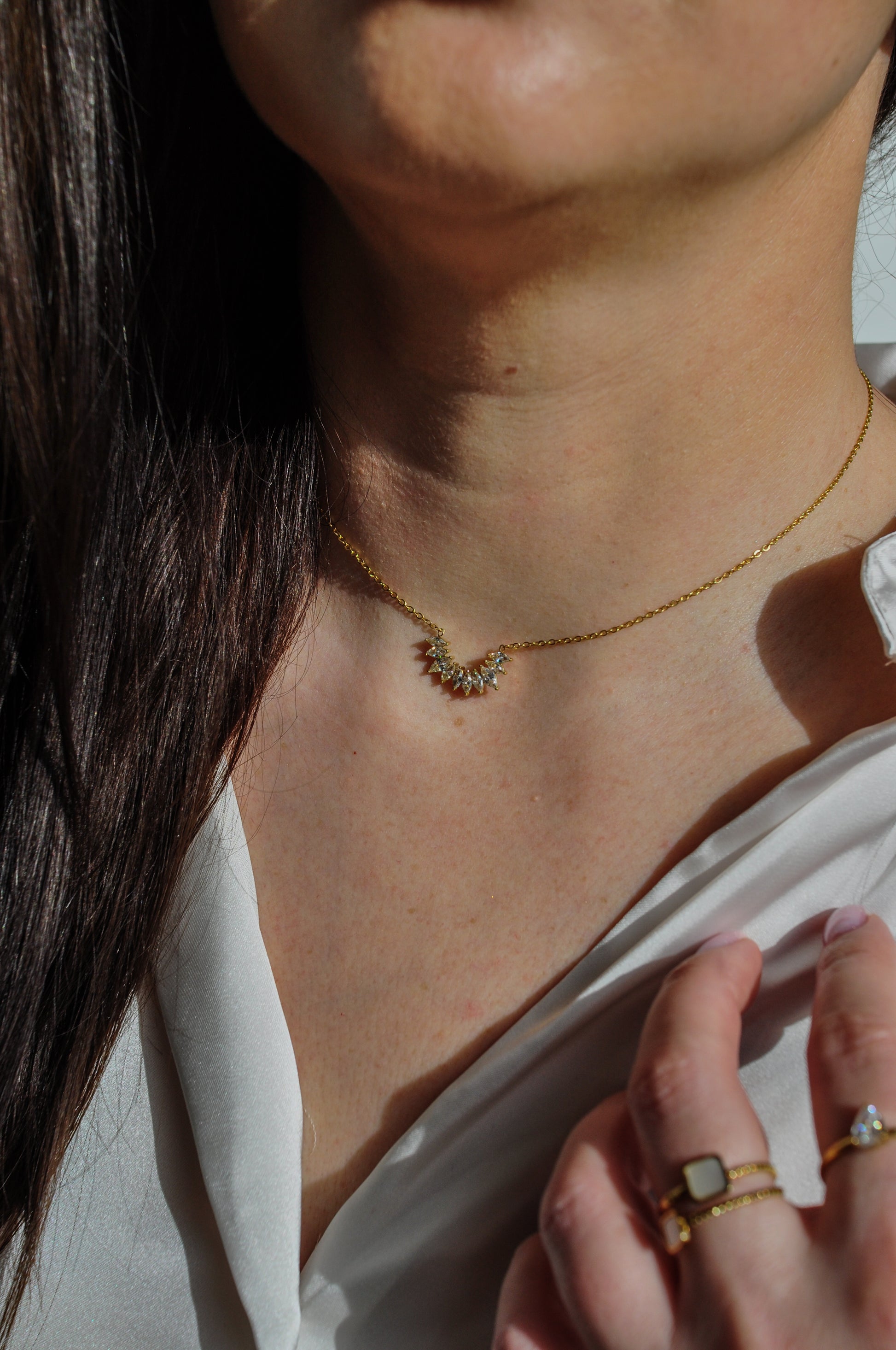 Collier en acier inoxydable composé d’une rangée de zircons. Tous nos bijoux résistent à l'eau, au soleil et ne rouillent pas dans le temps.