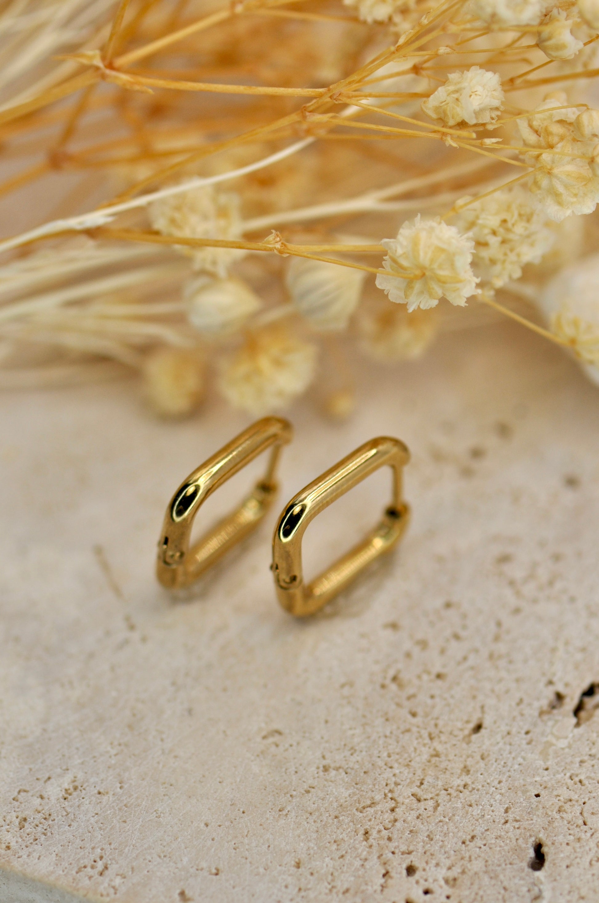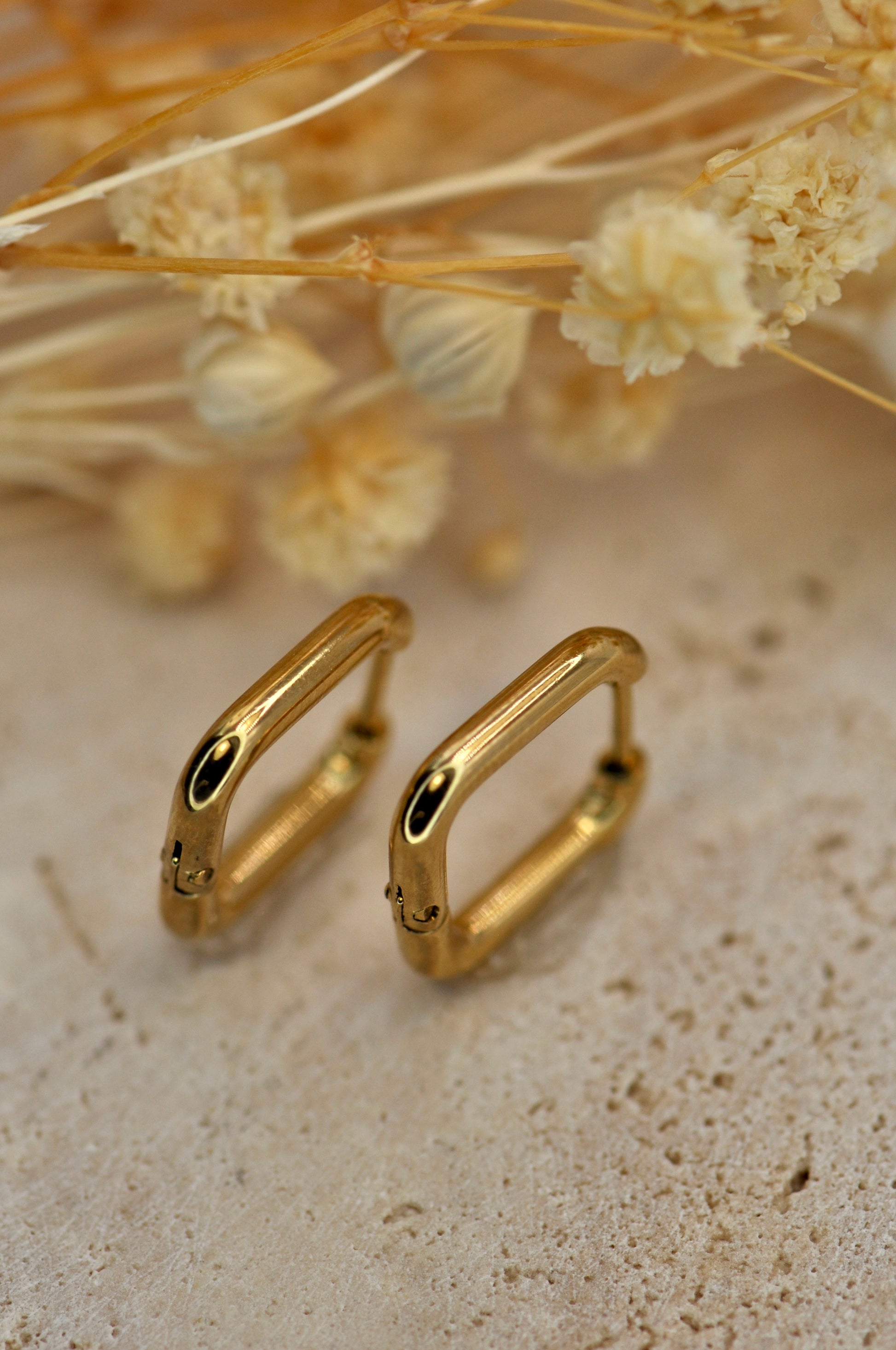Boucles d'oreilles type créoles à fermoir charnière en acier inoxydable en forme carré. Tous nos bijoux résistent à l'eau, au soleil et ne rouillent pas dans le temps.
