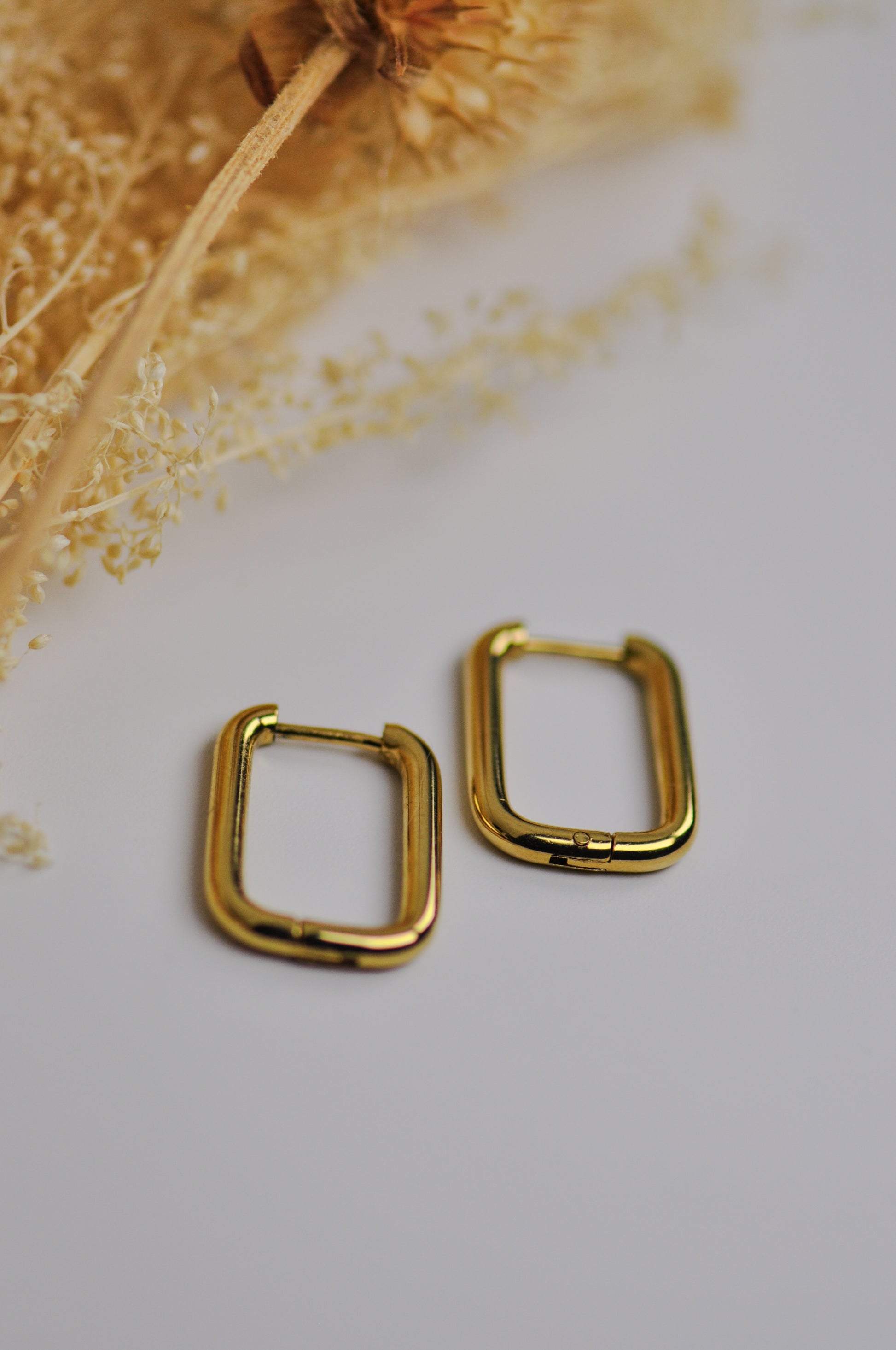 Boucles d'oreilles type créoles à fermoir charnière en acier inoxydable en forme rectangulaire. Tous nos bijoux résistent à l'eau, au soleil et ne rouillent pas dans le temps.
