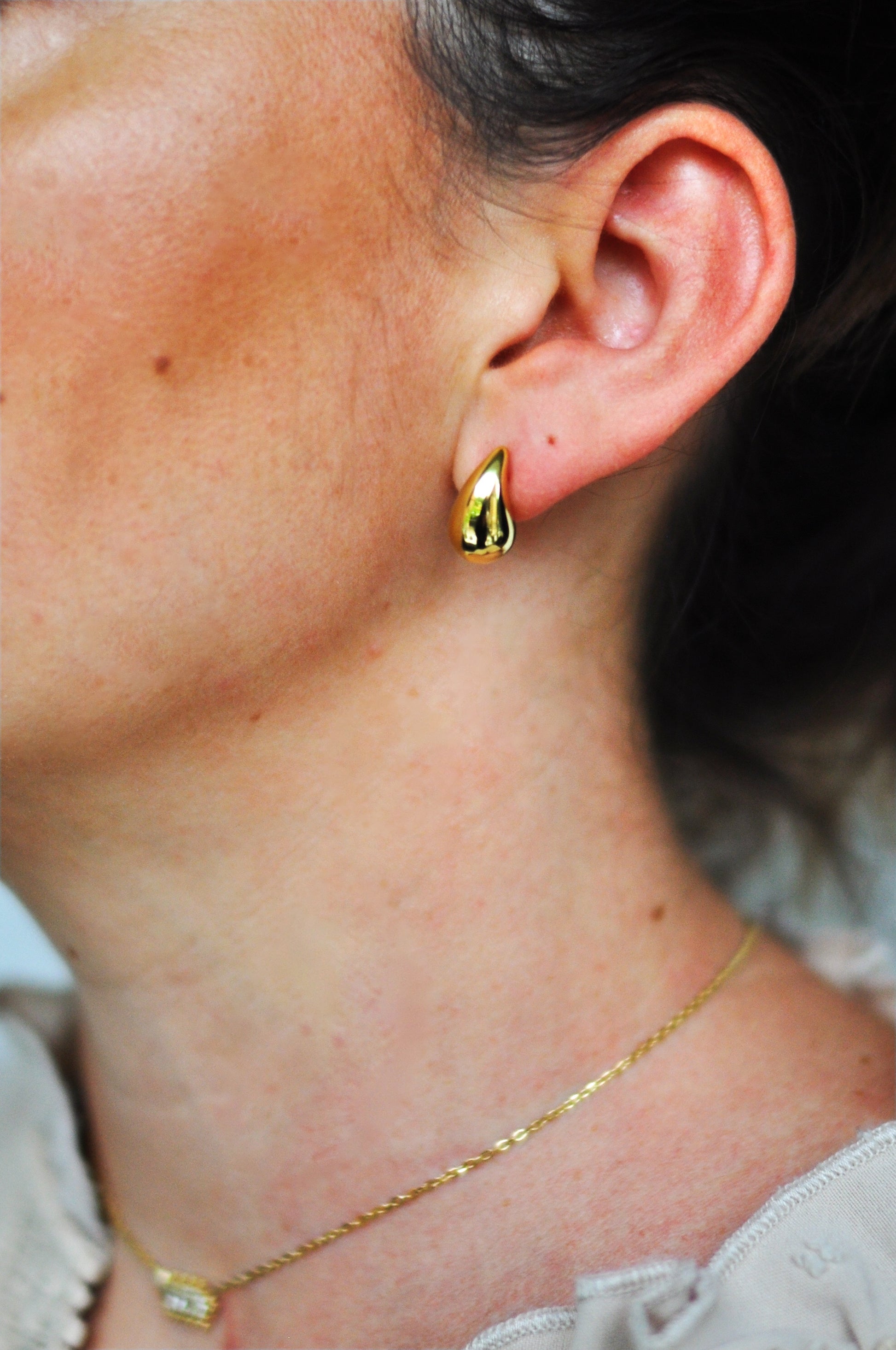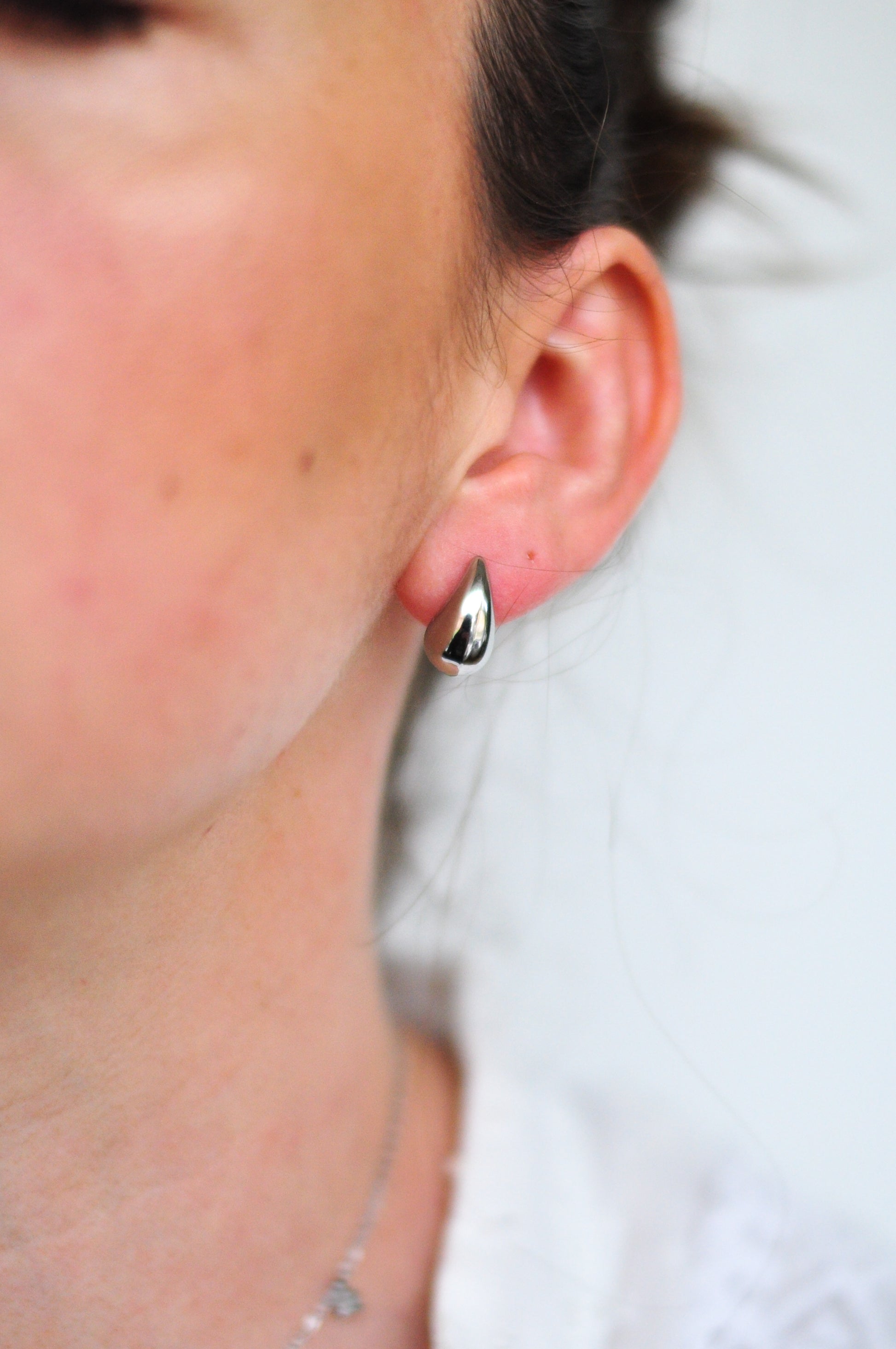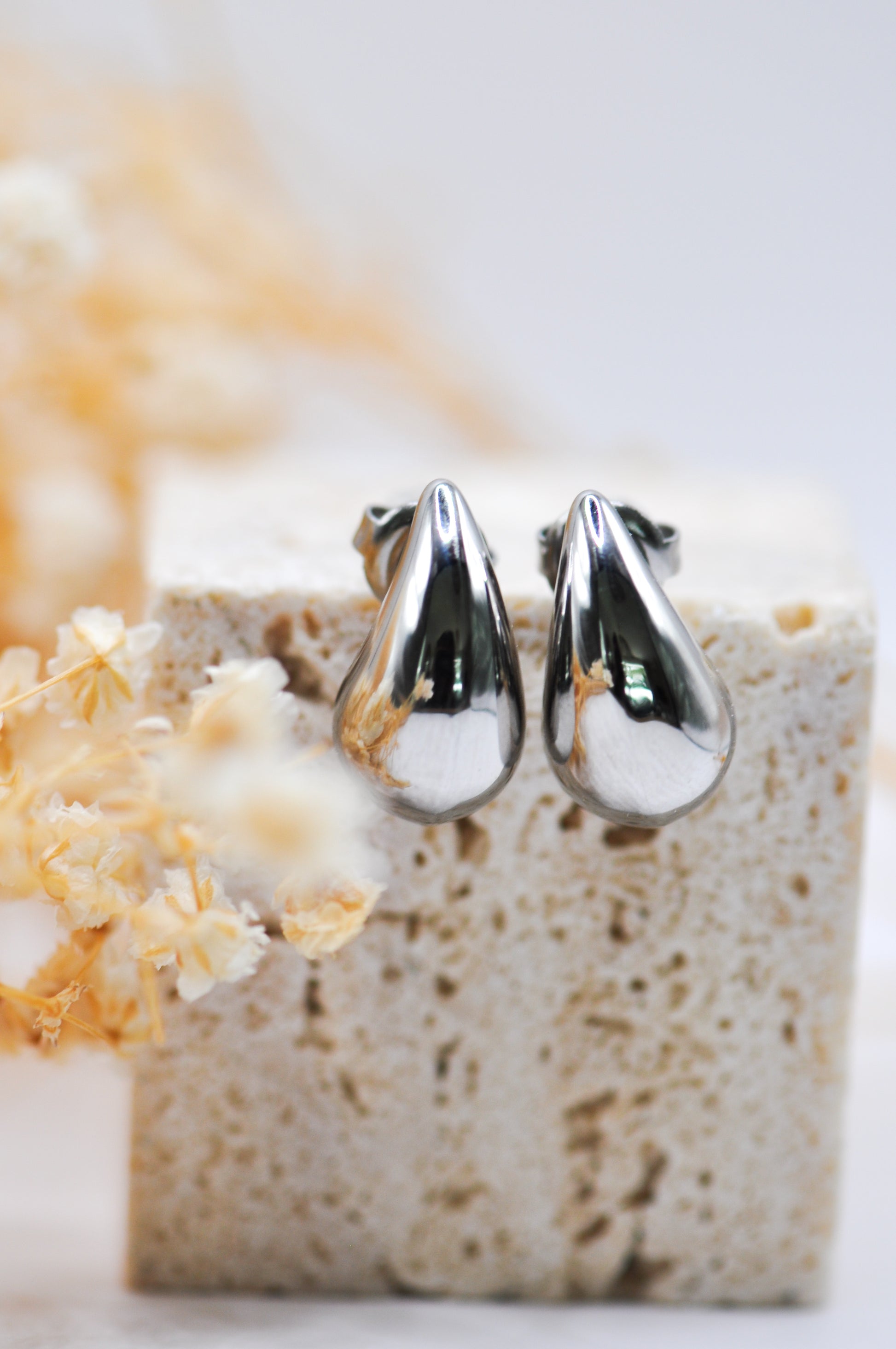Boucles d'oreilles puce en acier inoxydable aux formes de mini-gouttes. Tous nos bijoux résistent à l'eau, au soleil et ne rouillent pas dans le temps.