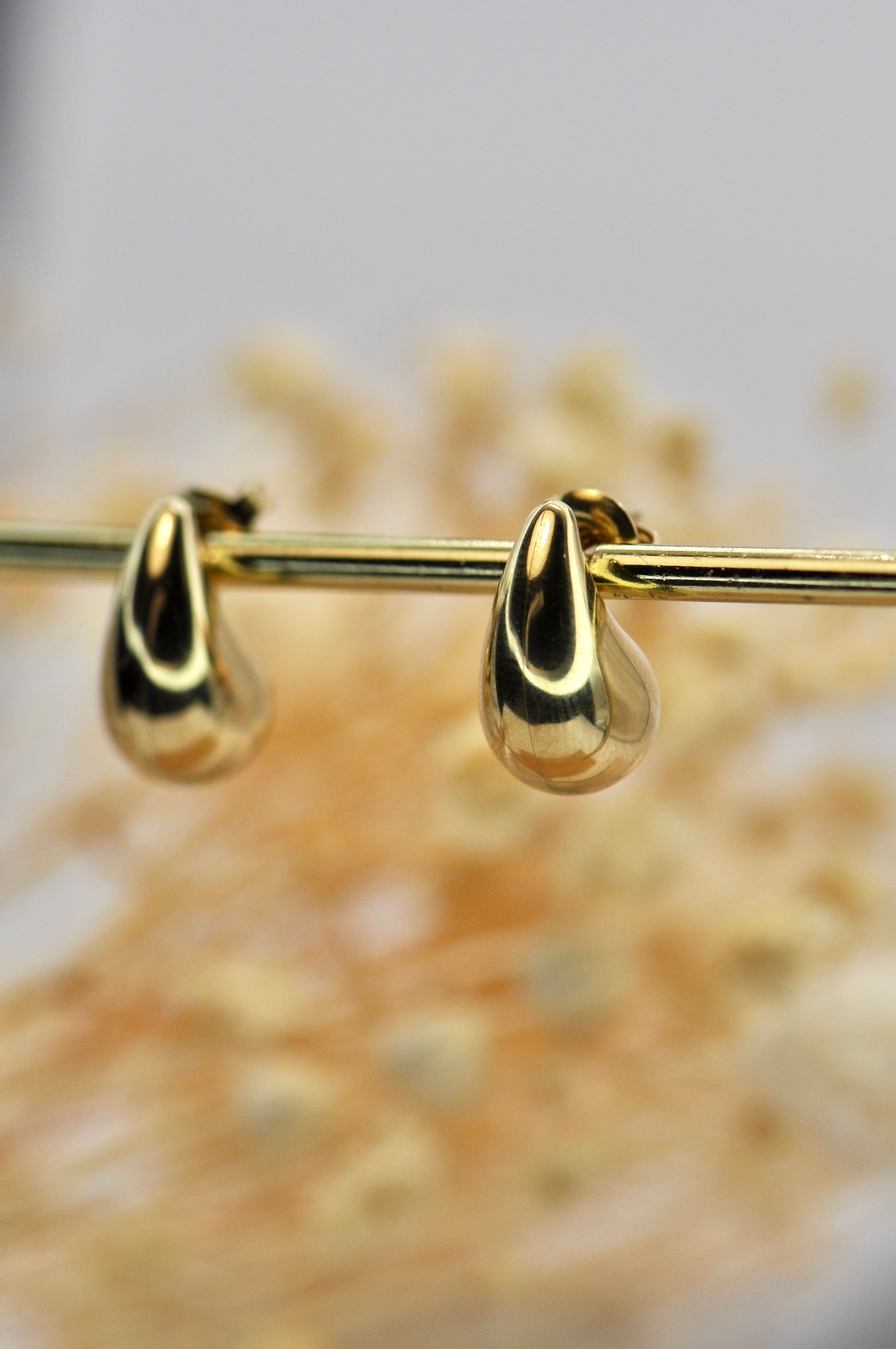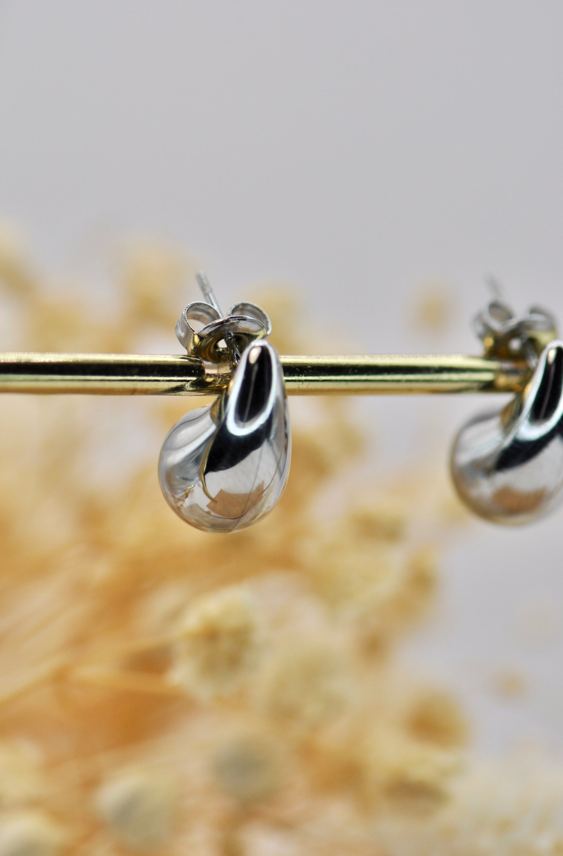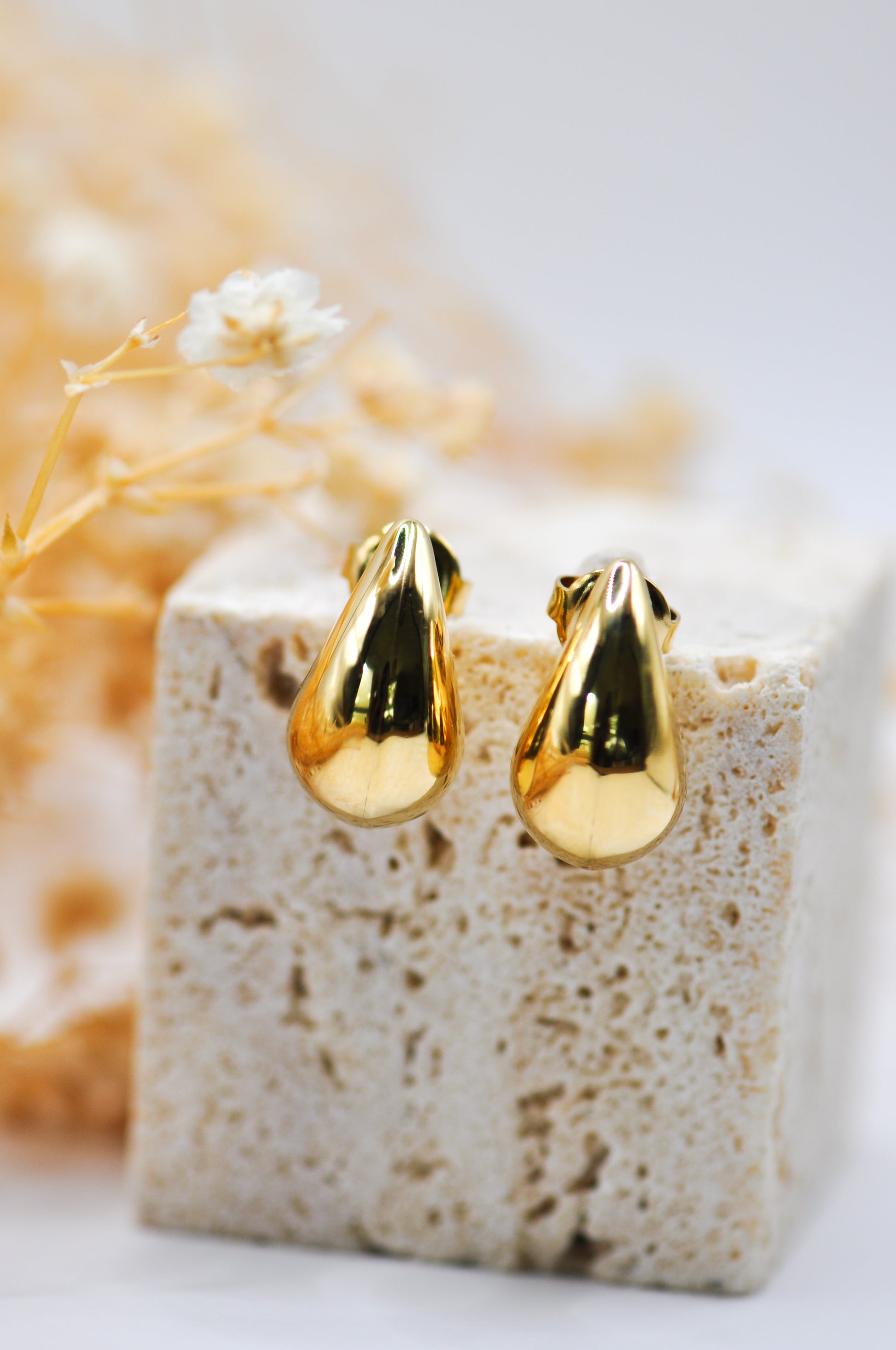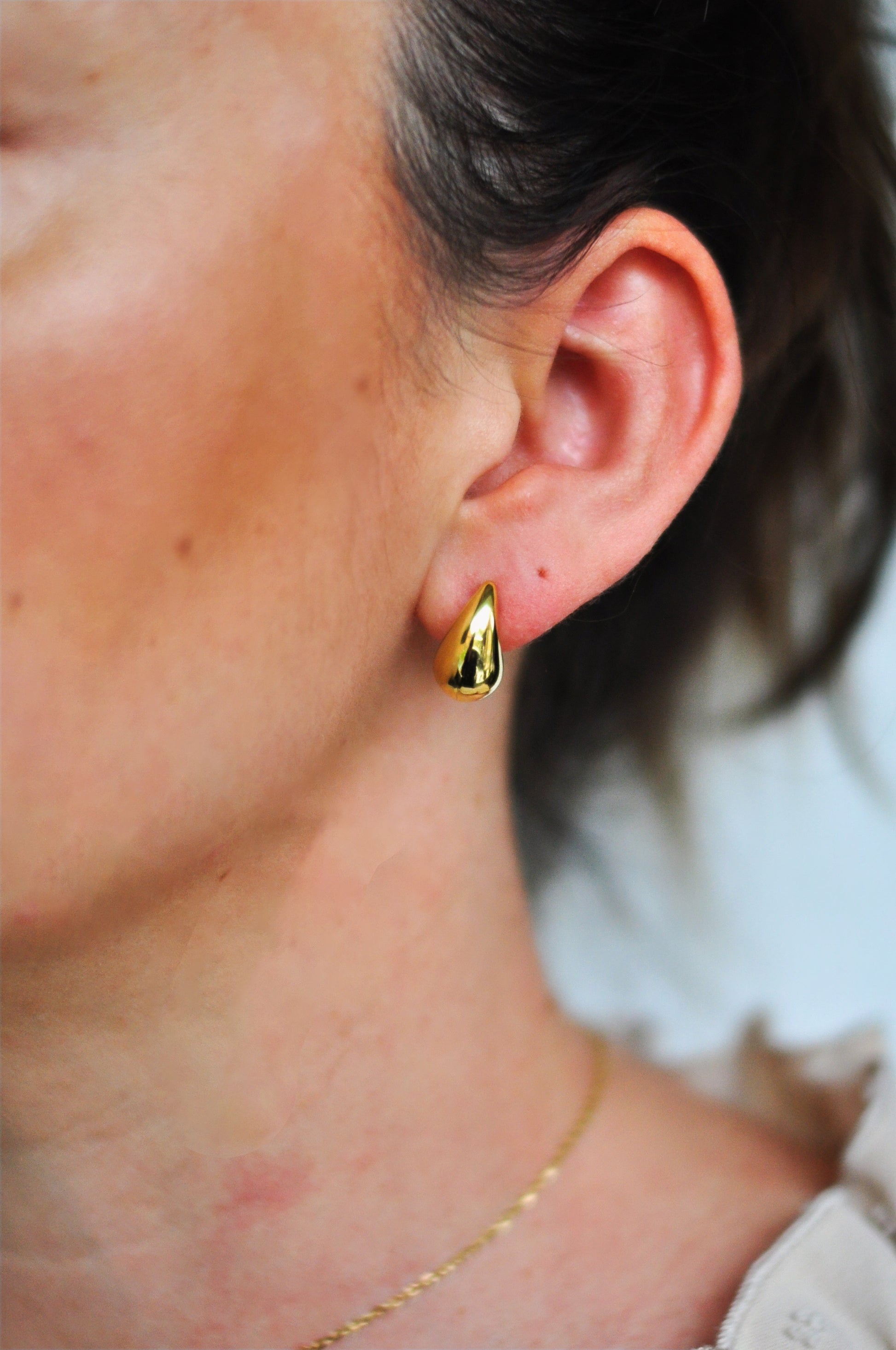 Boucles d'oreilles puce en acier inoxydable aux formes de mini-gouttes. Tous nos bijoux résistent à l'eau, au soleil et ne rouillent pas dans le temps.