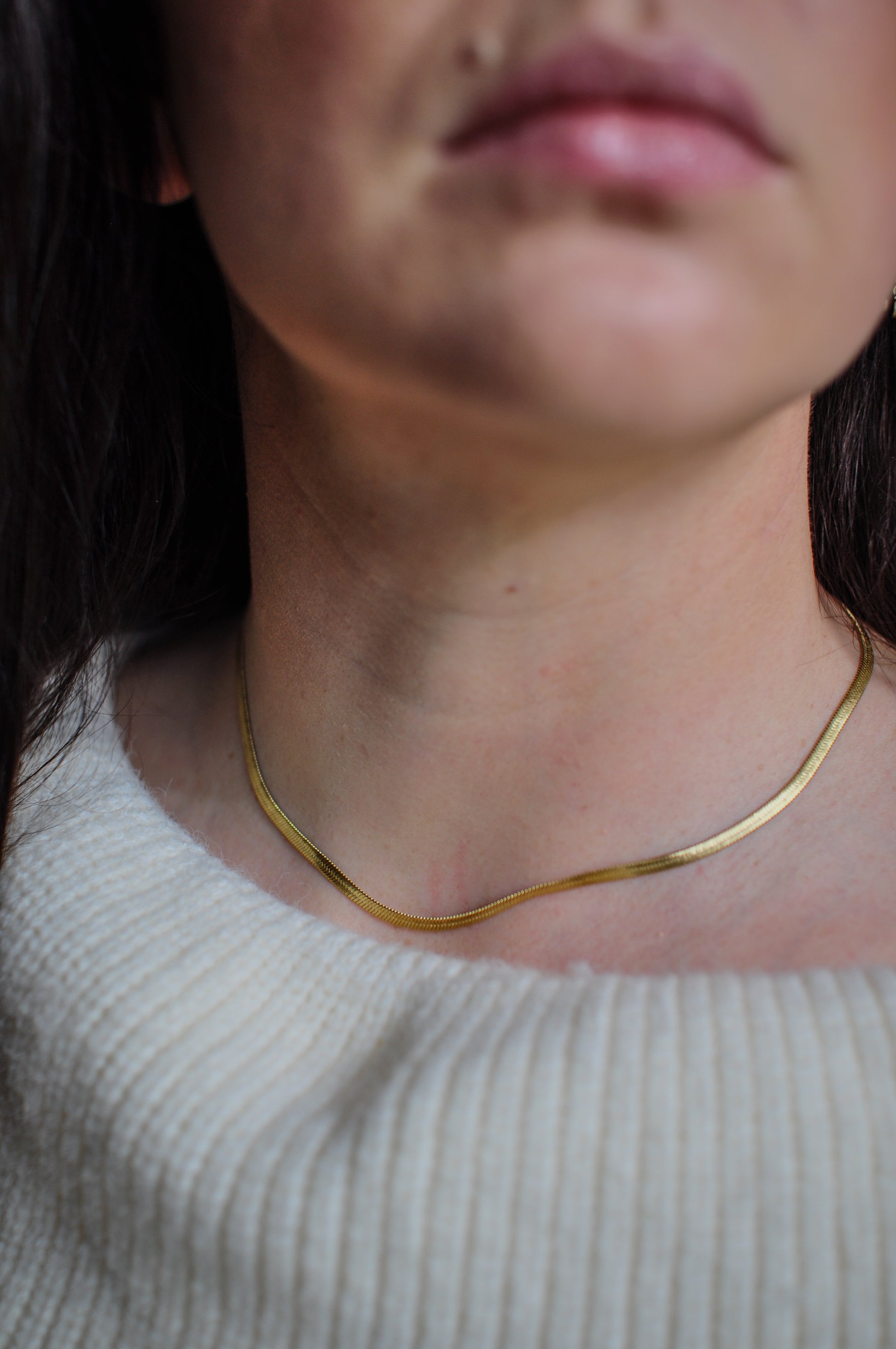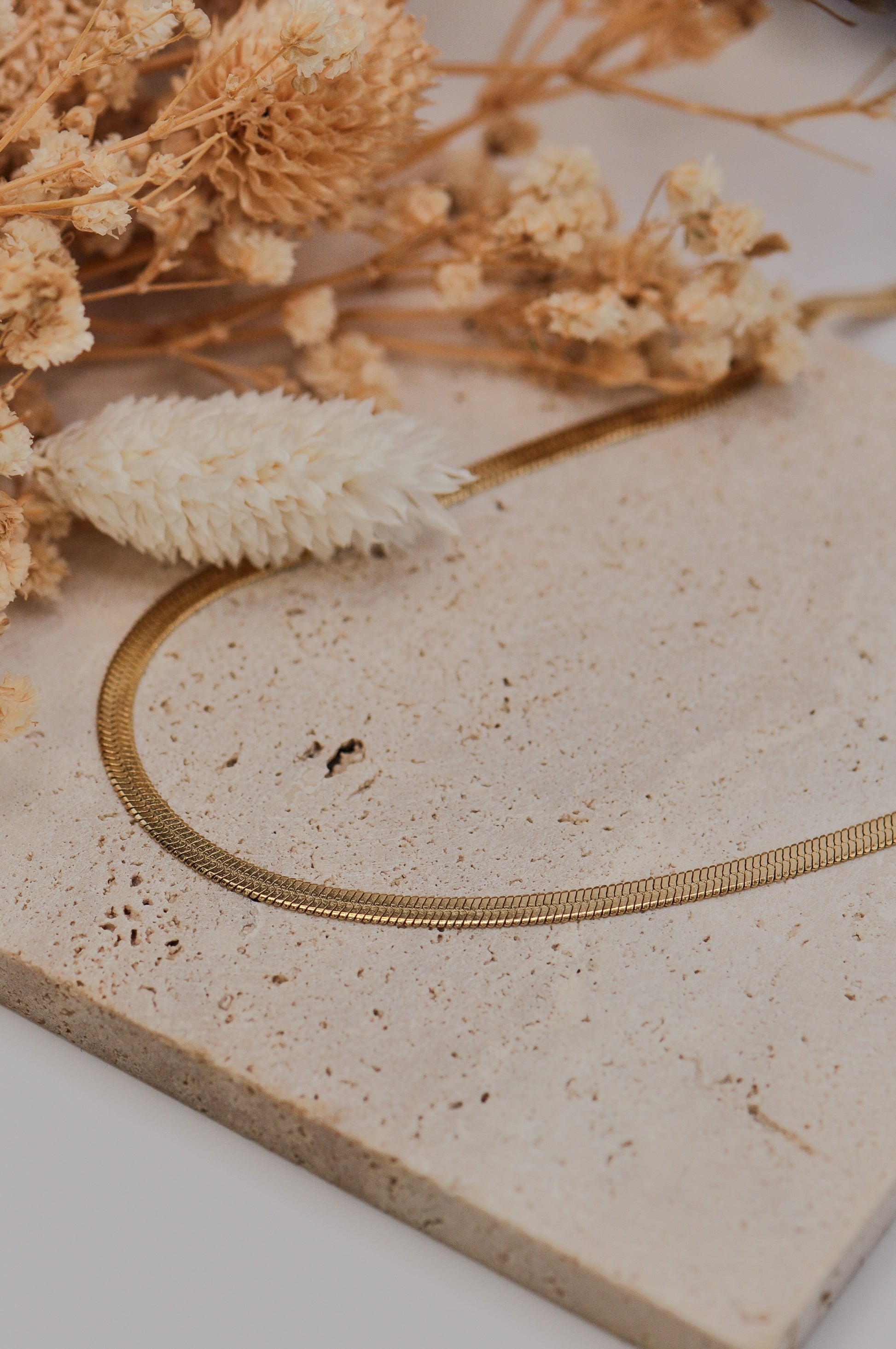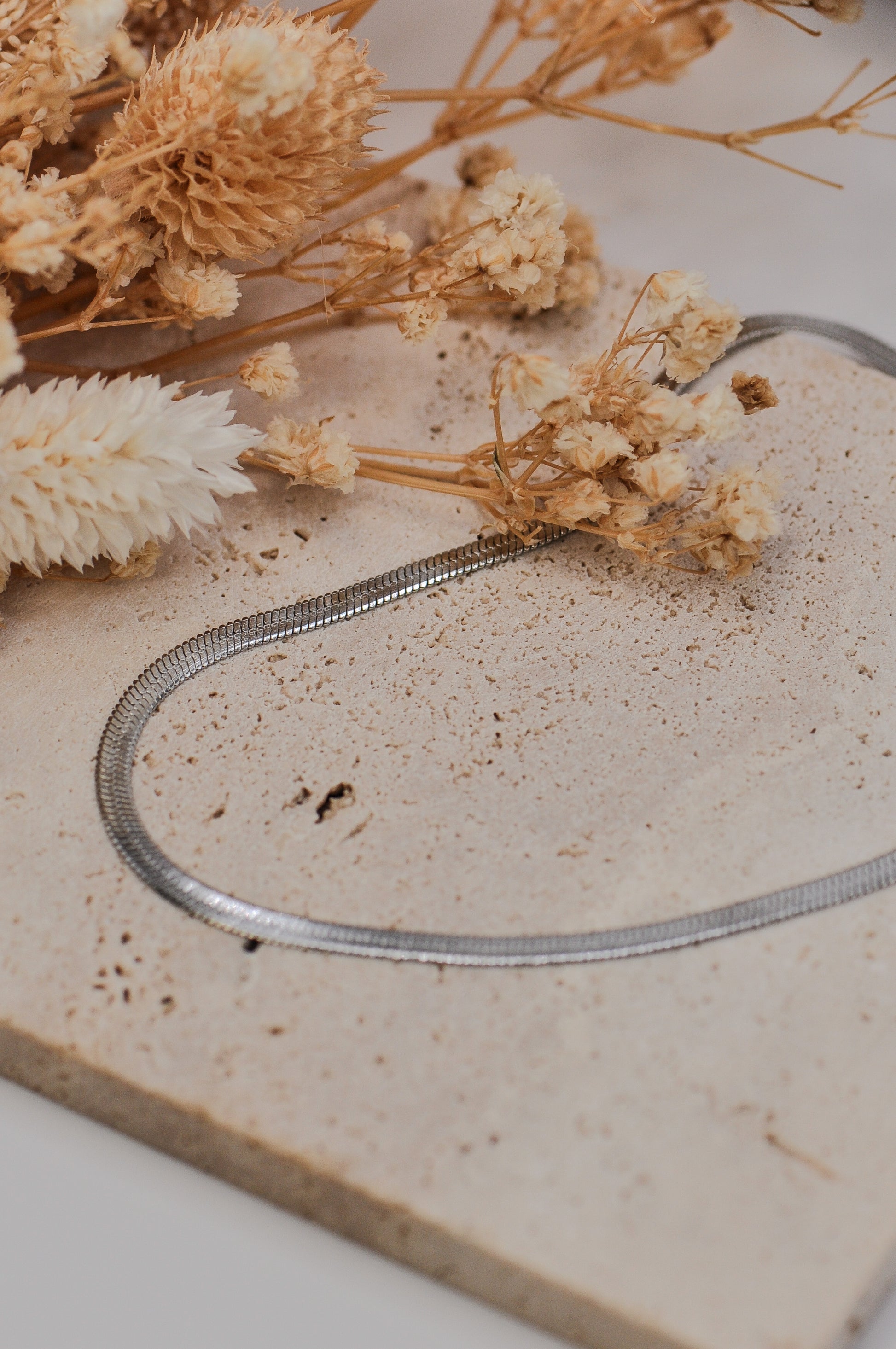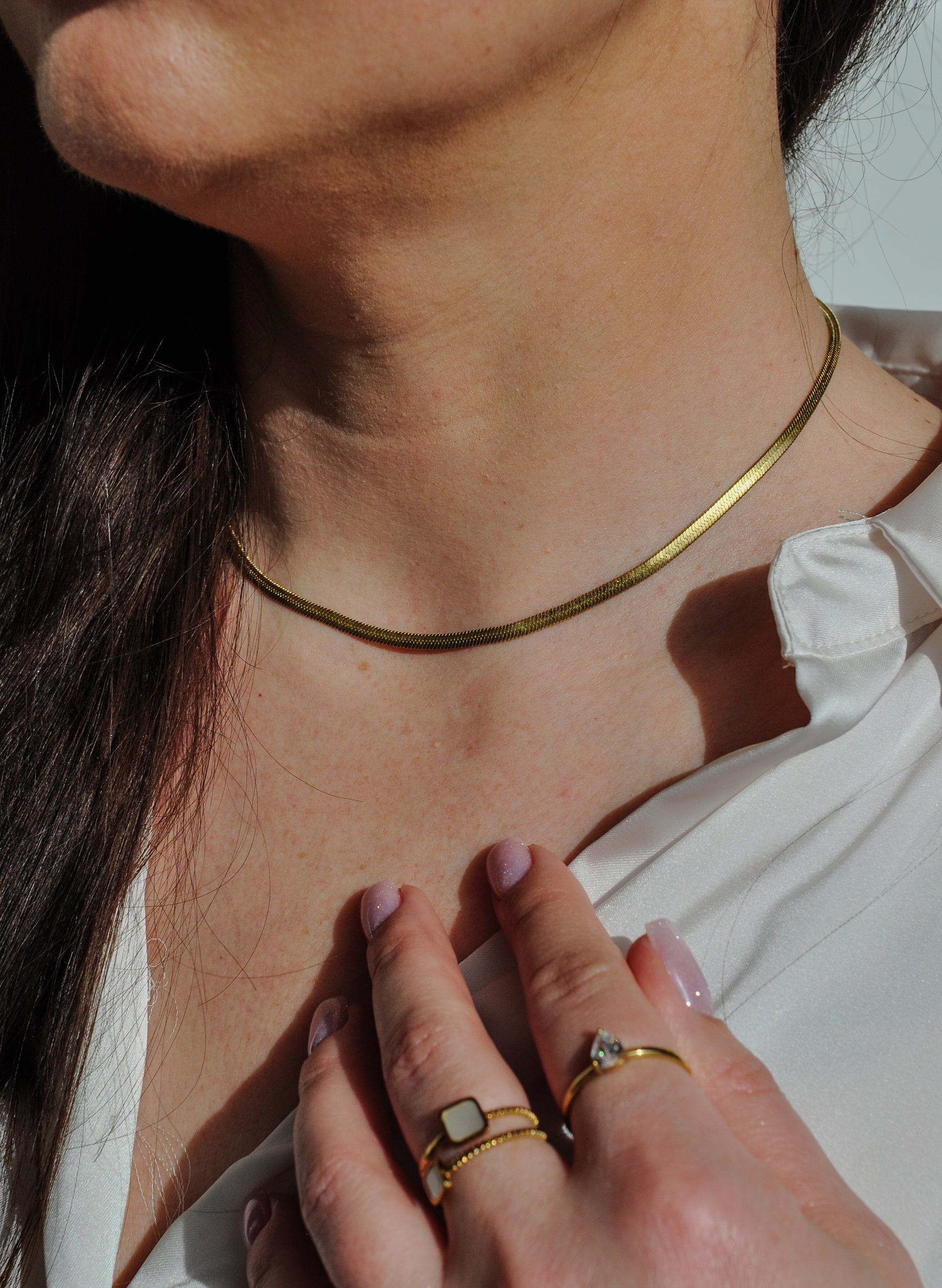 Collier en acier inoxydable composé d'une maille plate type miroir. Tous nos bijoux résistent à l'eau, au soleil et ne rouillent pas dans le temps.