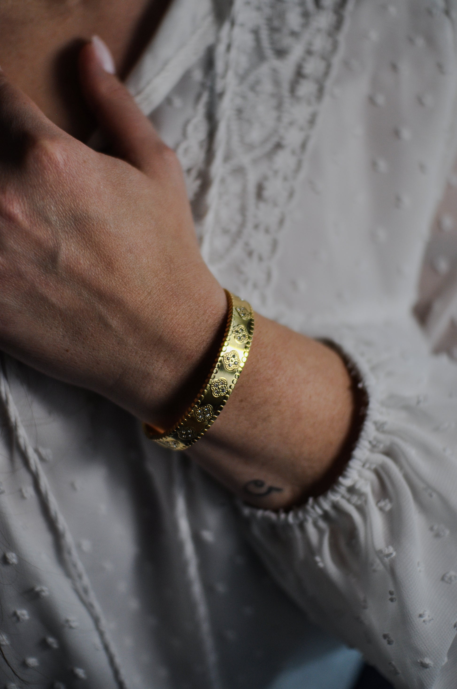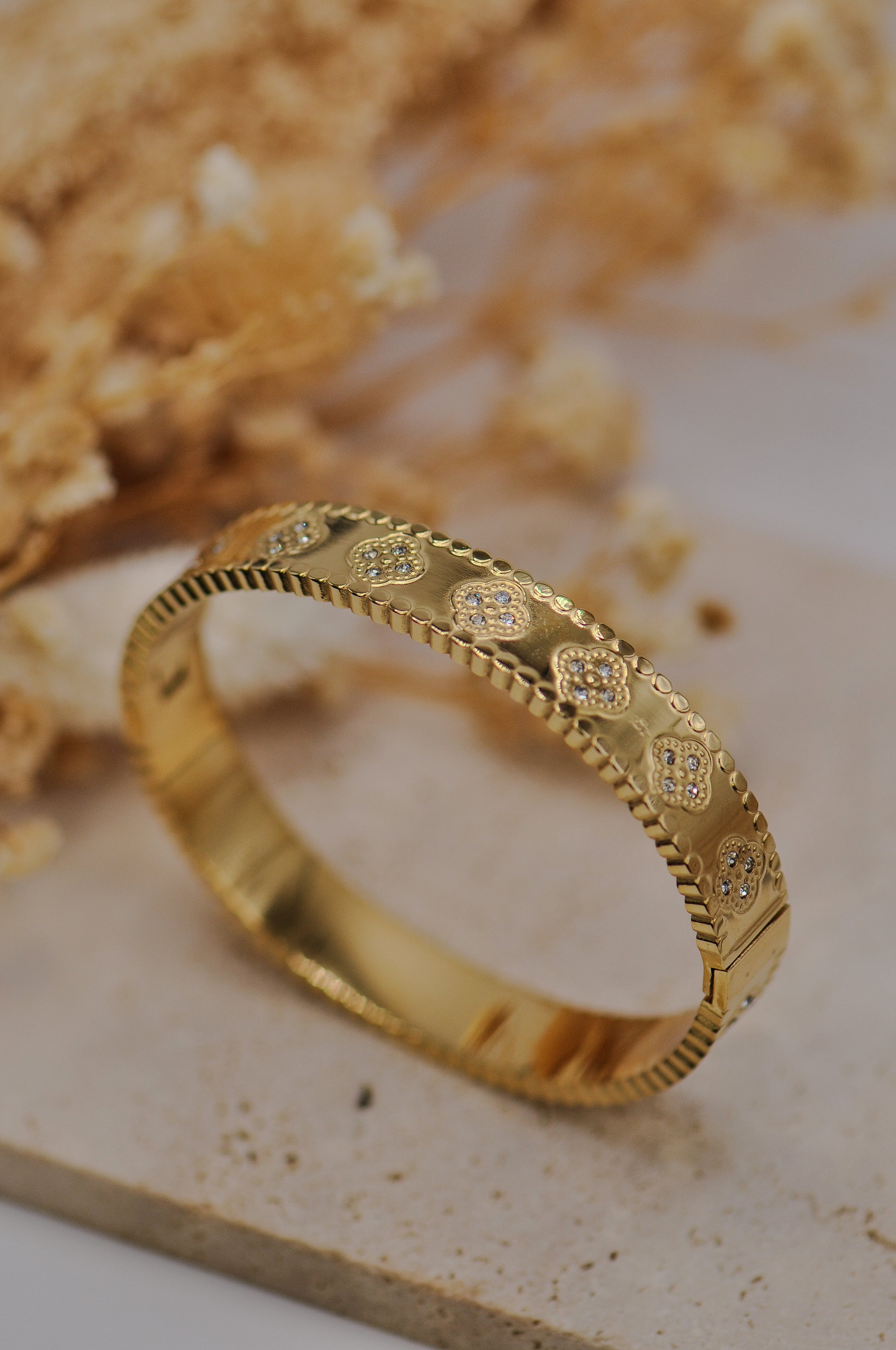 Jonc en acier inoxydable serti de véritables zircons avec un fermoir clip. Le jonc Zora convient à tout type de poignet, même les plus petits. Grâce à sa brillance extrême, il ajoutera éclat et élégance à toutes vos tenues.